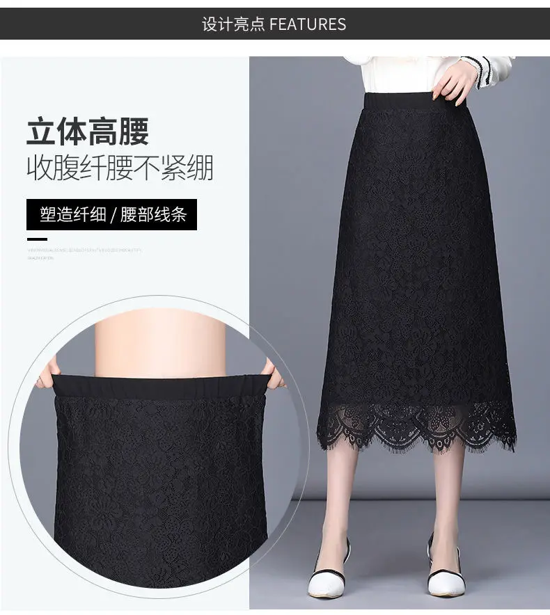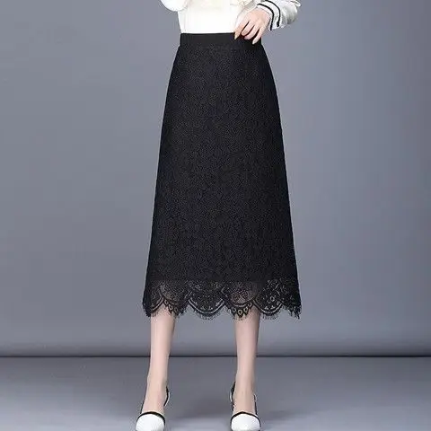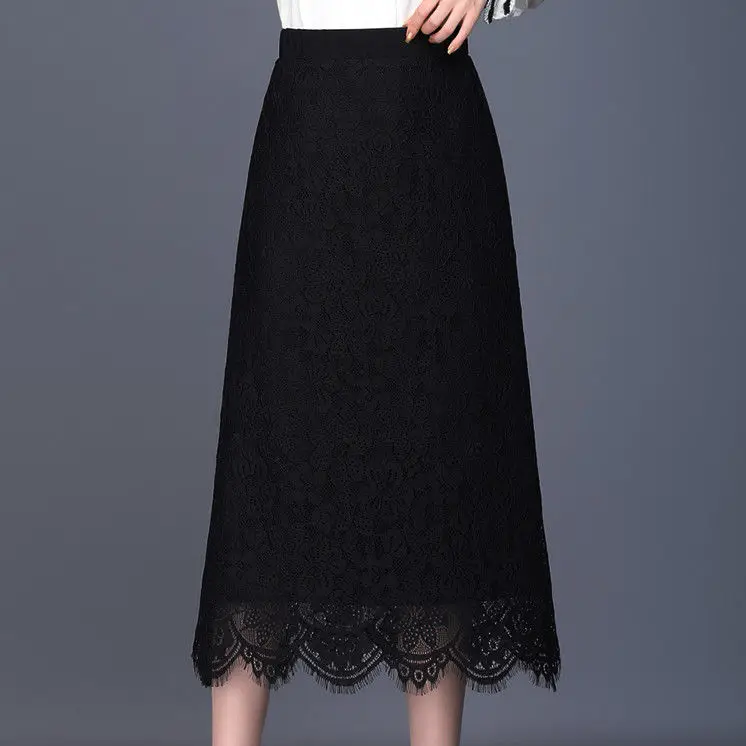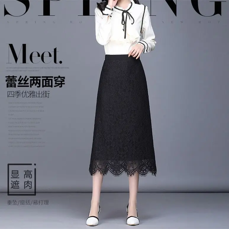 Gonna gonna di pizzo Nuova gonna a un passo sottile a vita alta con confezione sui fianchi Gonna di media lunghezza Gonna lunga nera