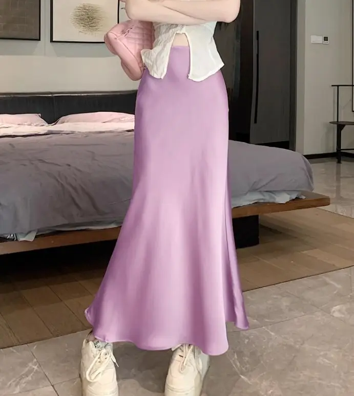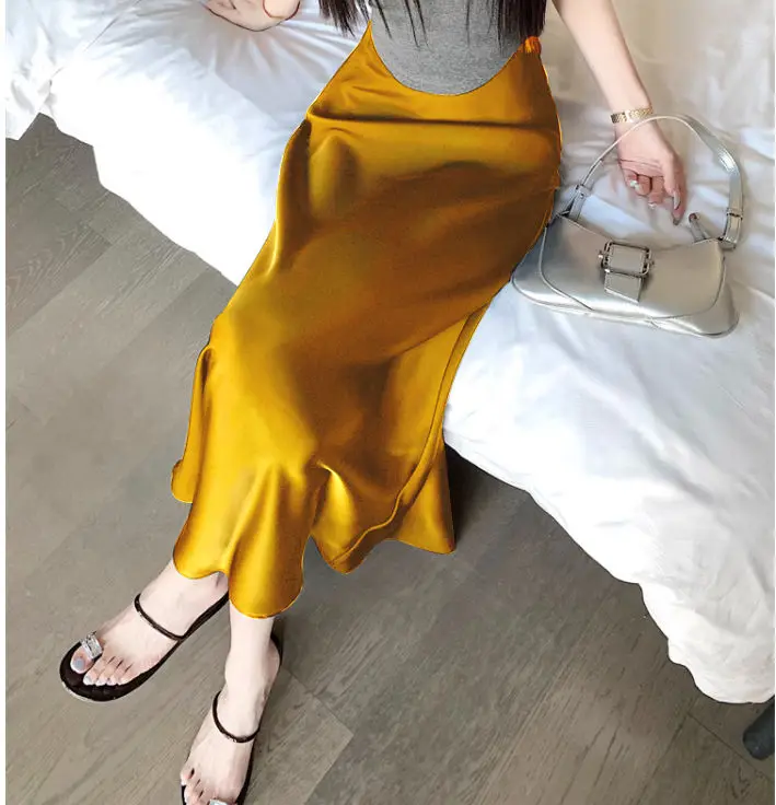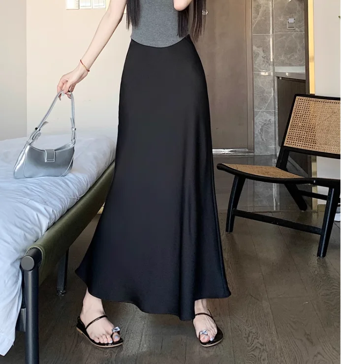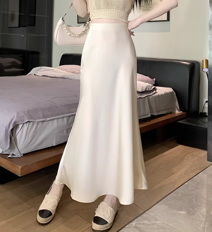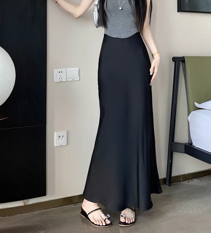 Gonna lunga in raso da donna estiva 2025 Gonna a sirena a vita alta in acetato a vita alta elegante Office Lady gonne bianche nere dorate