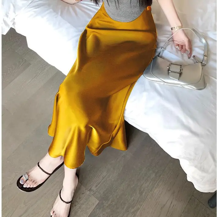 Gonna lunga in raso da donna estiva 2025 Gonna a sirena a vita alta in acetato a vita alta elegante Office Lady gonne bianche nere dorate