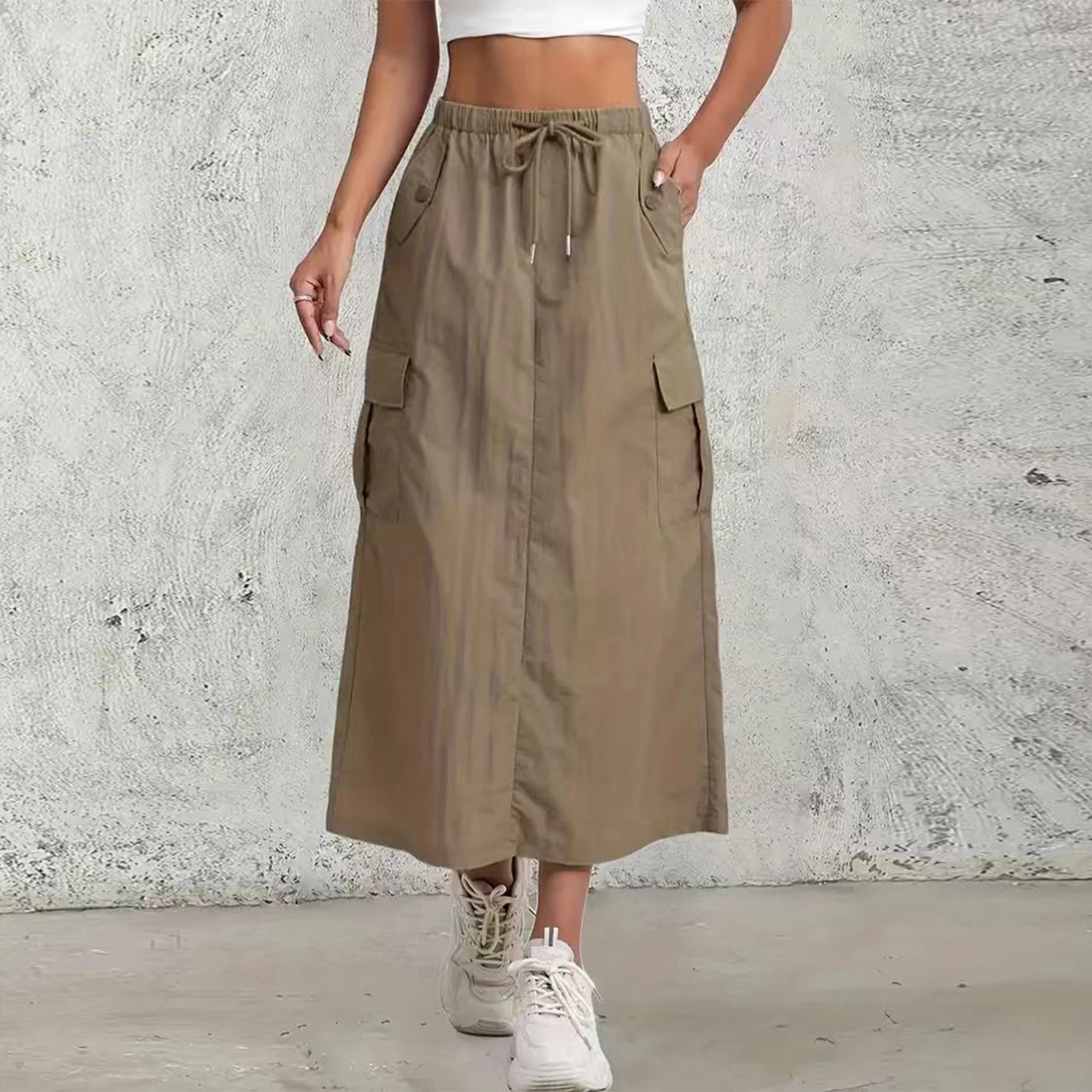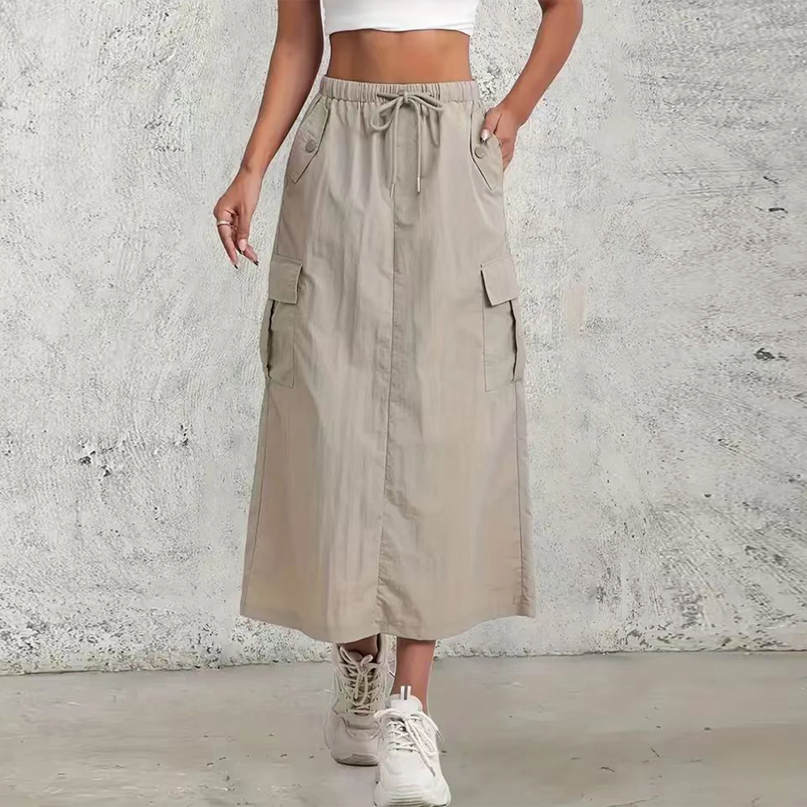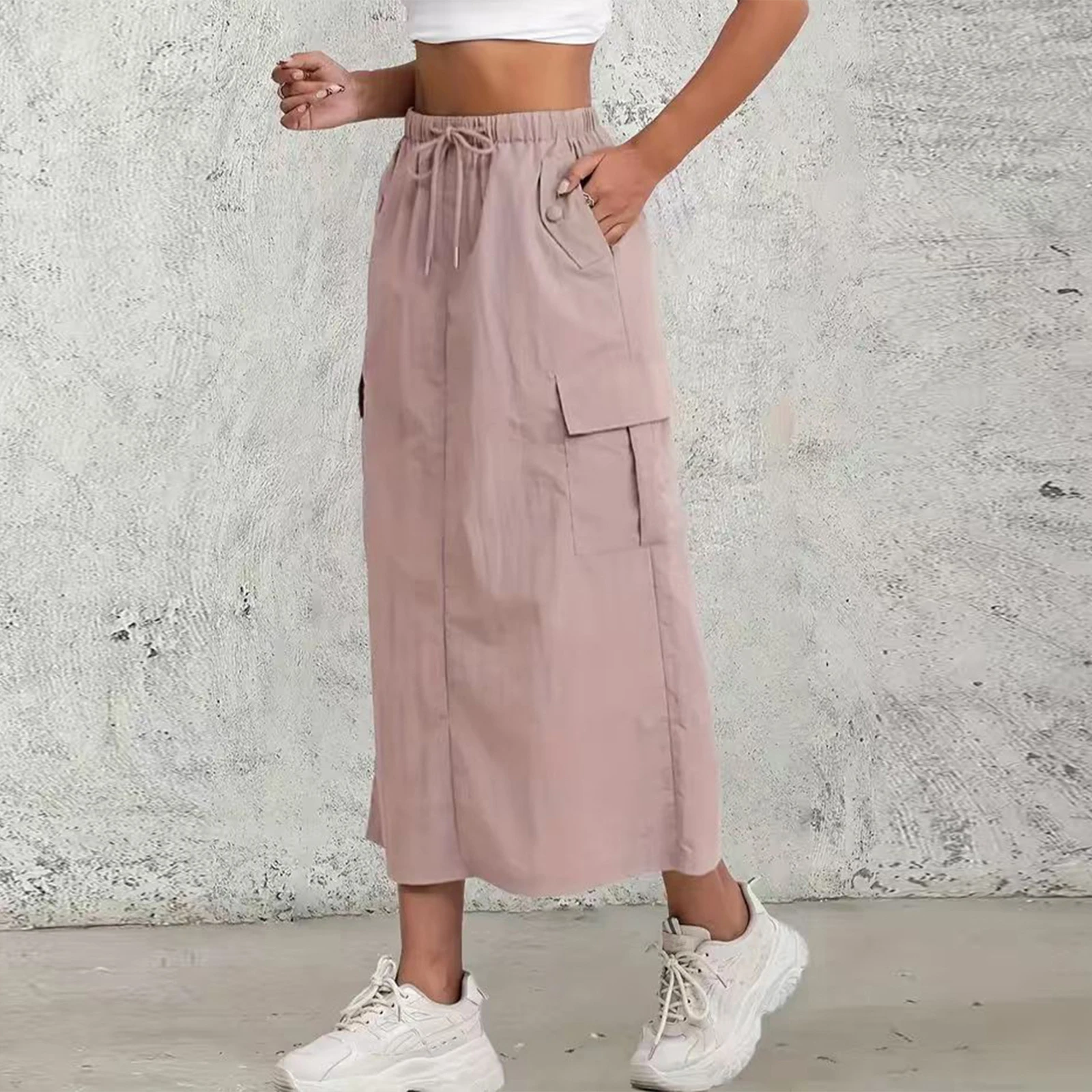 Gonna da donna con spacco sul retro con tasca a trapezio a vita alta elastica con coulisse in tinta unita alla moda