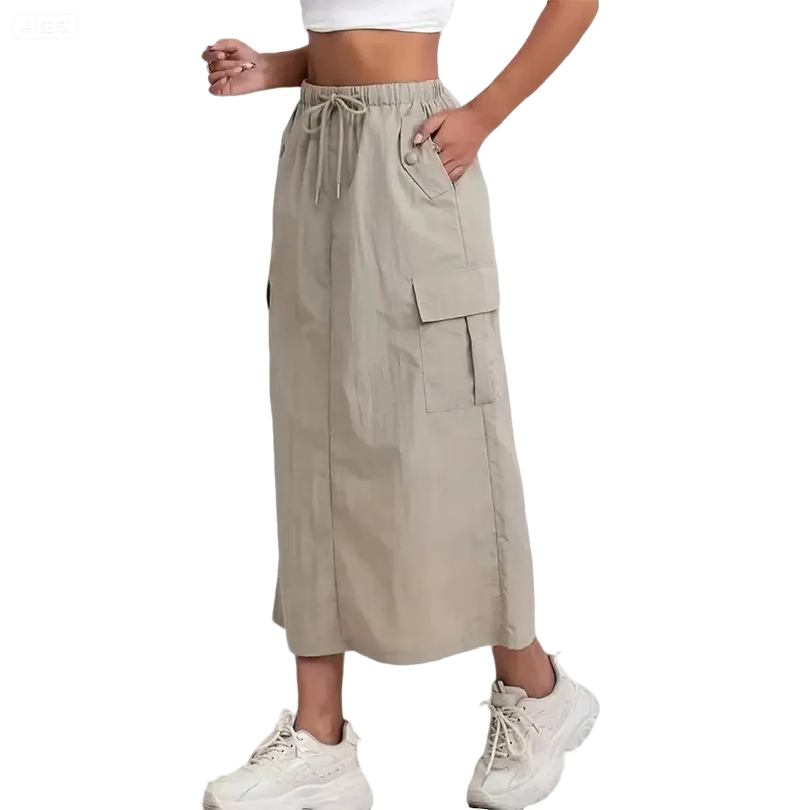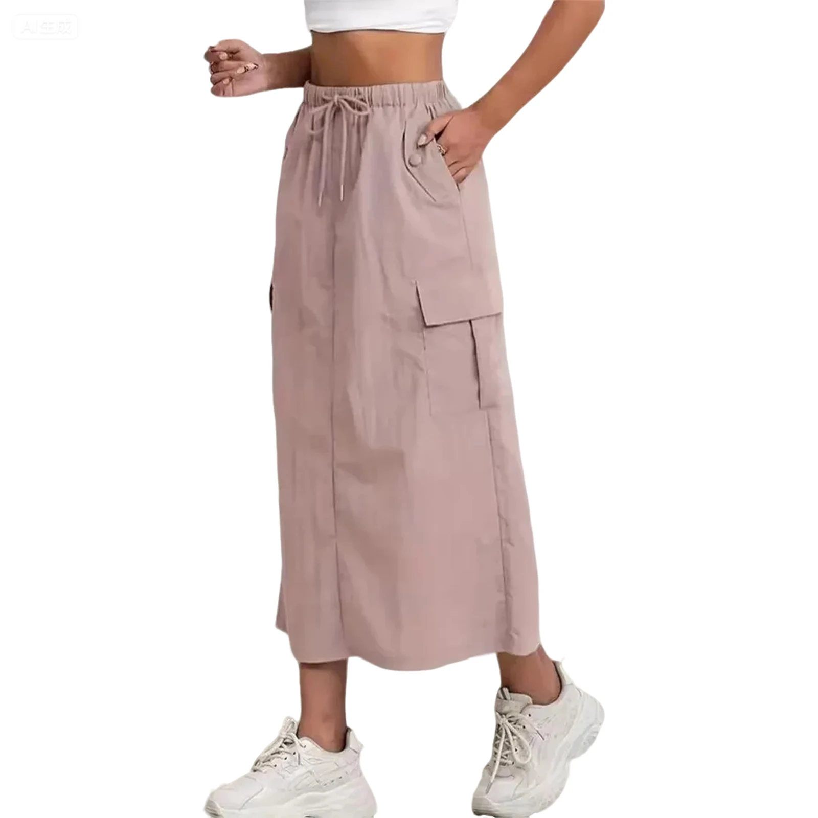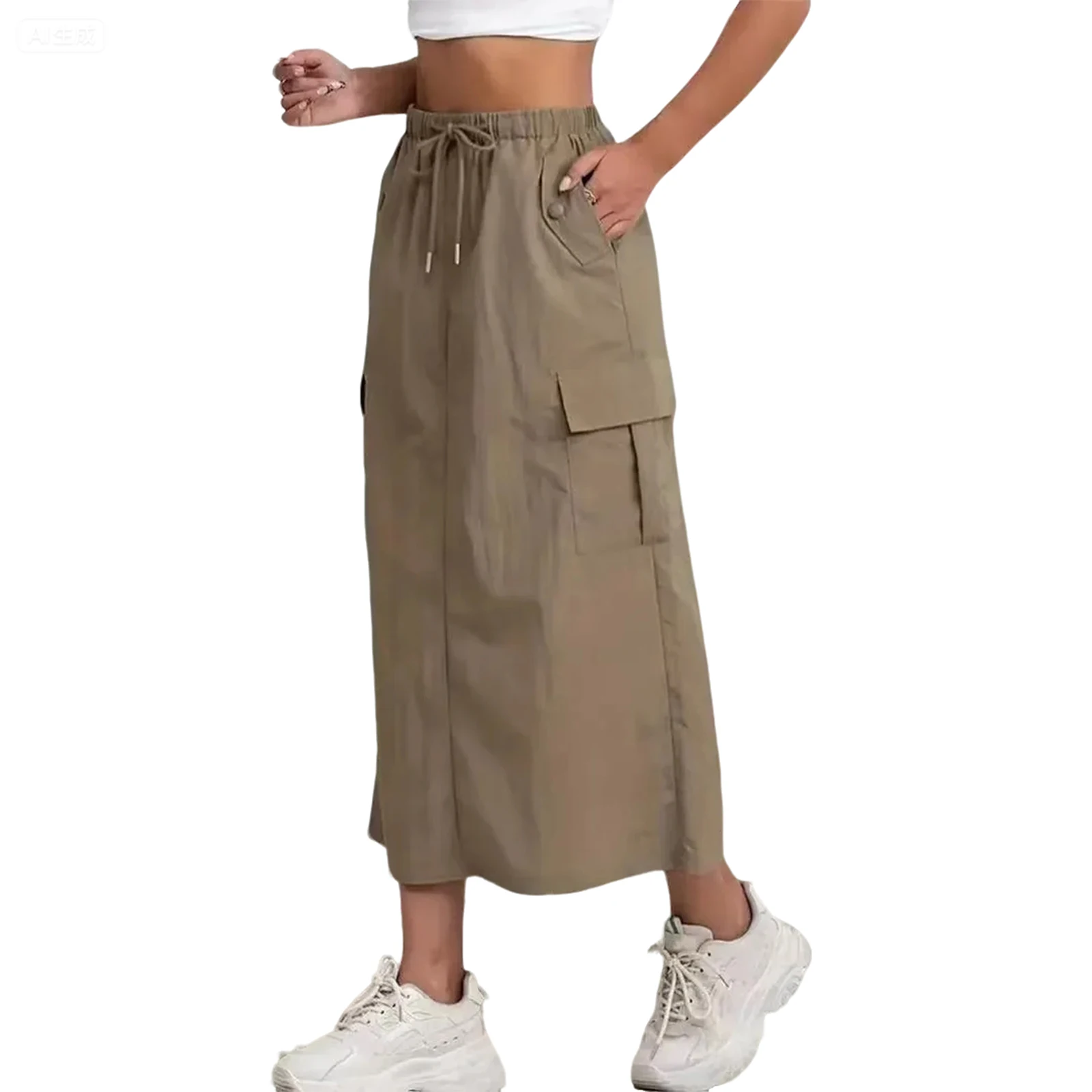Gonna da donna con spacco sul retro con tasca a trapezio a vita alta elastica con coulisse in tinta unita alla moda