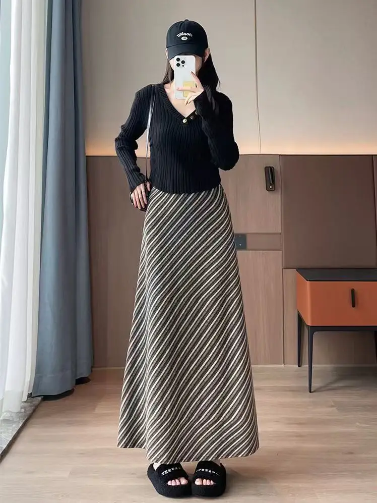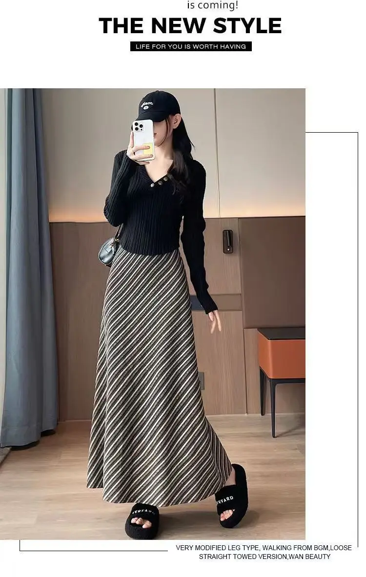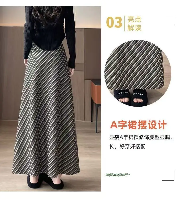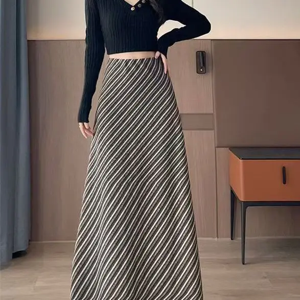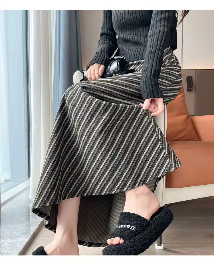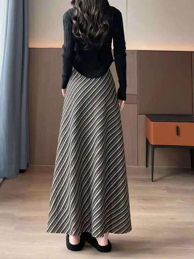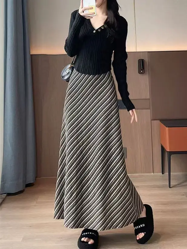 Gonna slim a vita alta stile retrò Autunno Nuova gonna lunga a righe stile lungo