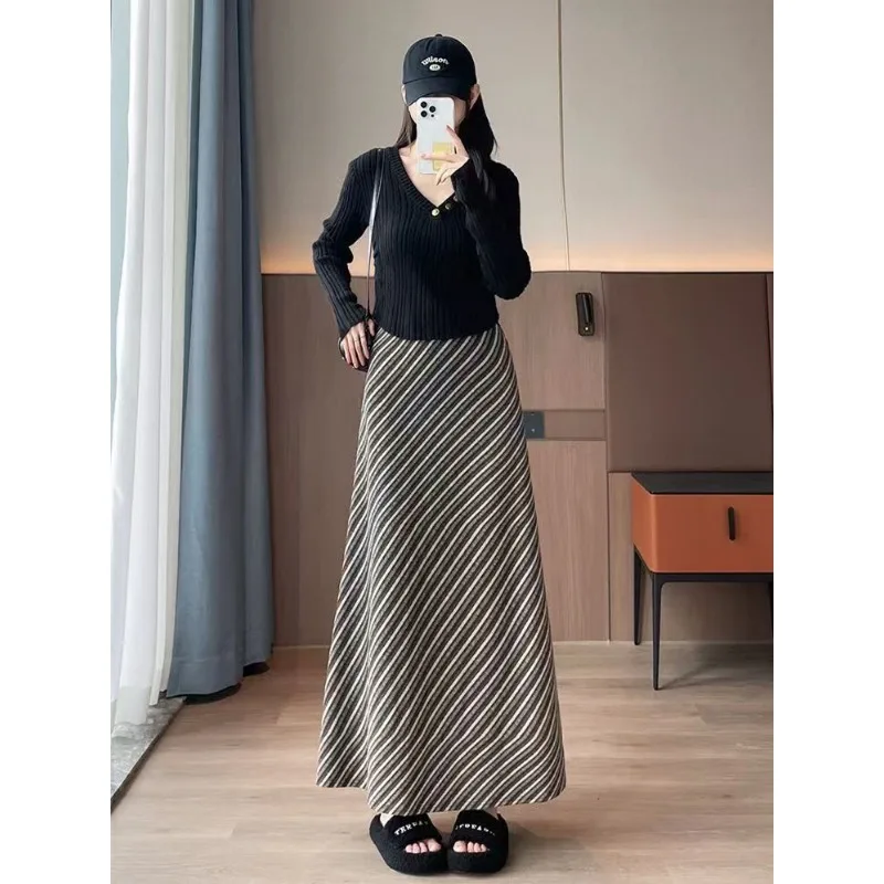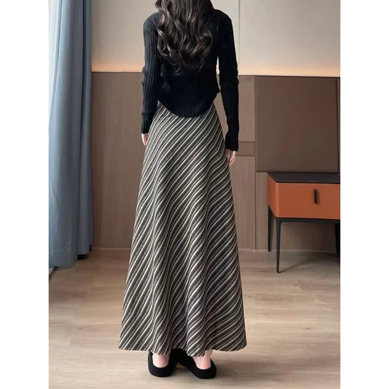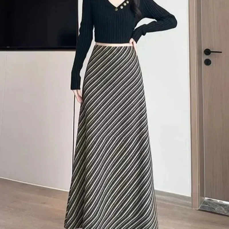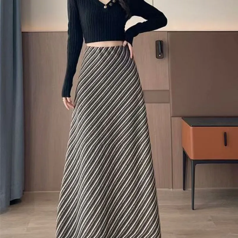 Gonna slim a vita alta stile retrò Autunno Nuova gonna lunga a righe stile lungo