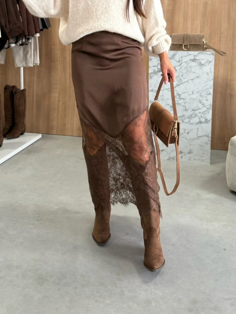 Gonne di pizzo patchwork da donna 2023 Nuove gonne lunghe scavate slim a vita alta Gonna Boho da club di moda marrone autunnale