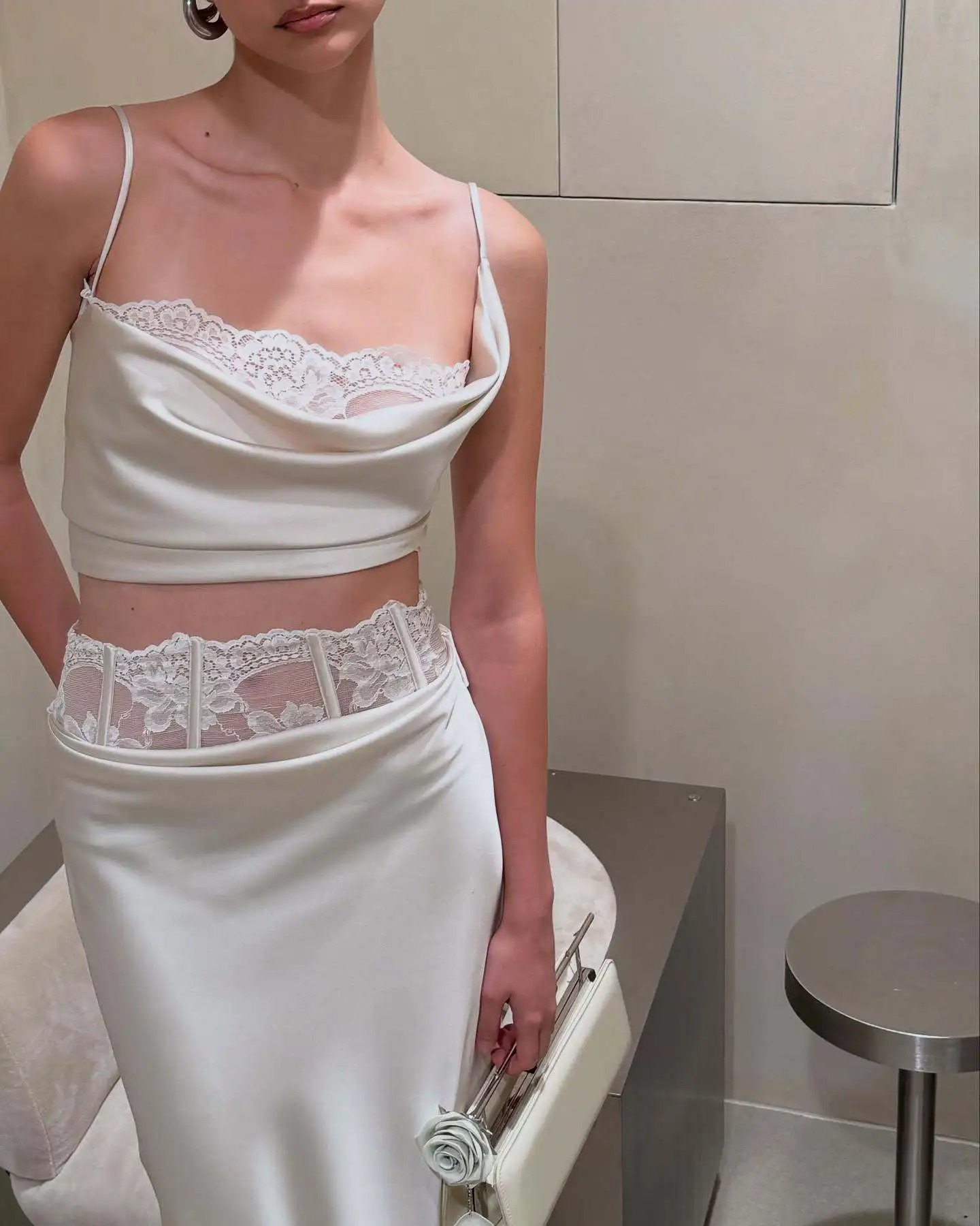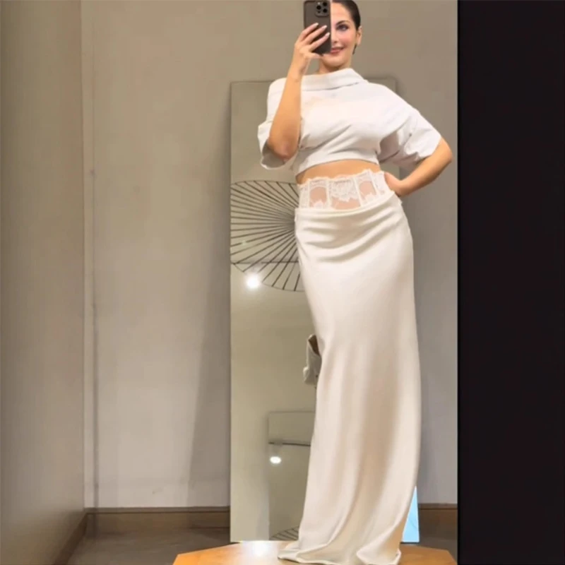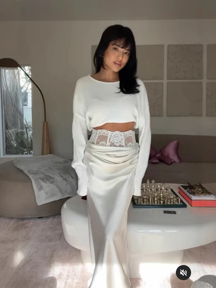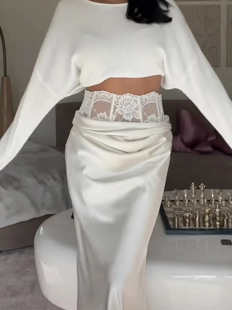 Gonne lunghe in raso sexy per le donne Patchwork Stampa di pizzo Fiore A-line Gonna a pieghe a vita alta Femminile Party Club 2025 Nuovo Slim Lon