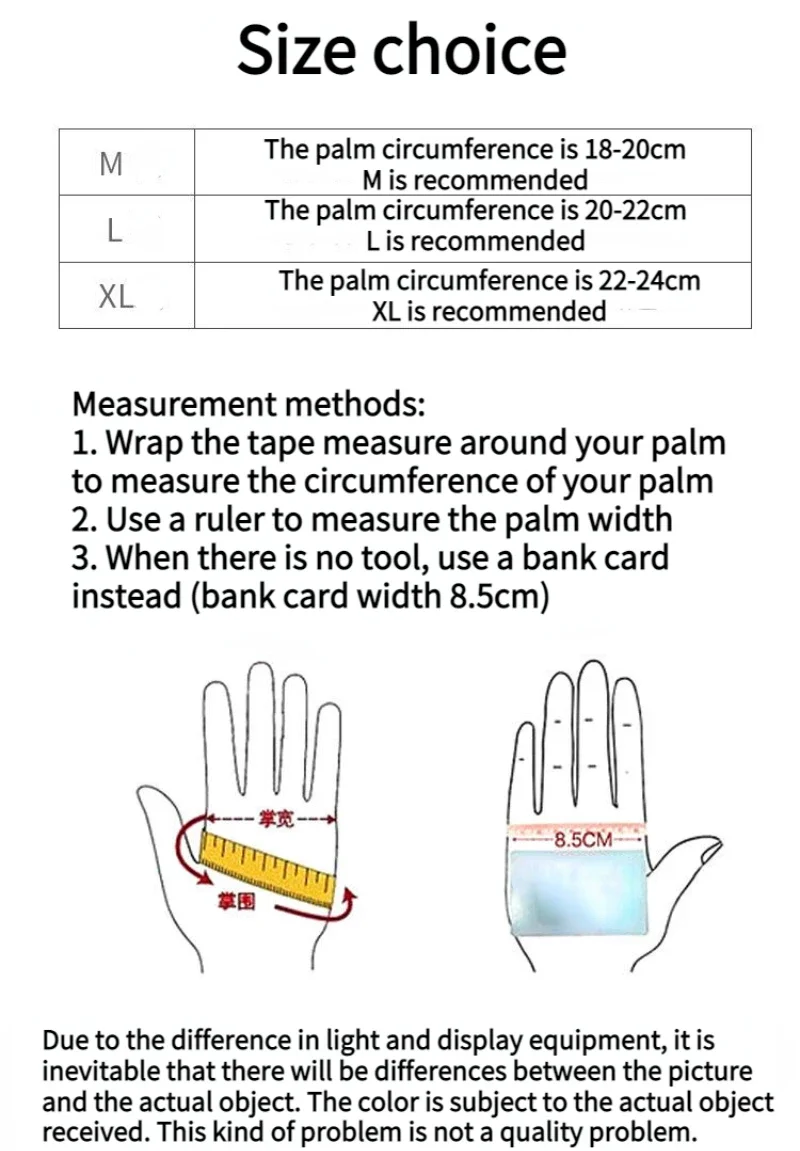 Metodi di misurazione: 1.Avvolgi il metro a nastro attorno al palmo della mano per misurare la circonferenza del palmo della mano 2.Usa un righello per misurare la larghezza del palmo 3.Quando non è presente uno strumento, utilizzare invece una carta bancaria (larghezza carta bancaria 8,5 cm) Metodi di misurazione: 1.Avvolgi il metro a nastro attorno al palmo della mano per misurare la circonferenza del palmo della mano 2.Usa un righello per misurare la larghezza del palmo 3. Quando non è presente uno strumento, utilizzare invece una carta bancaria (larghezza carta bancaria 8,5 cm)