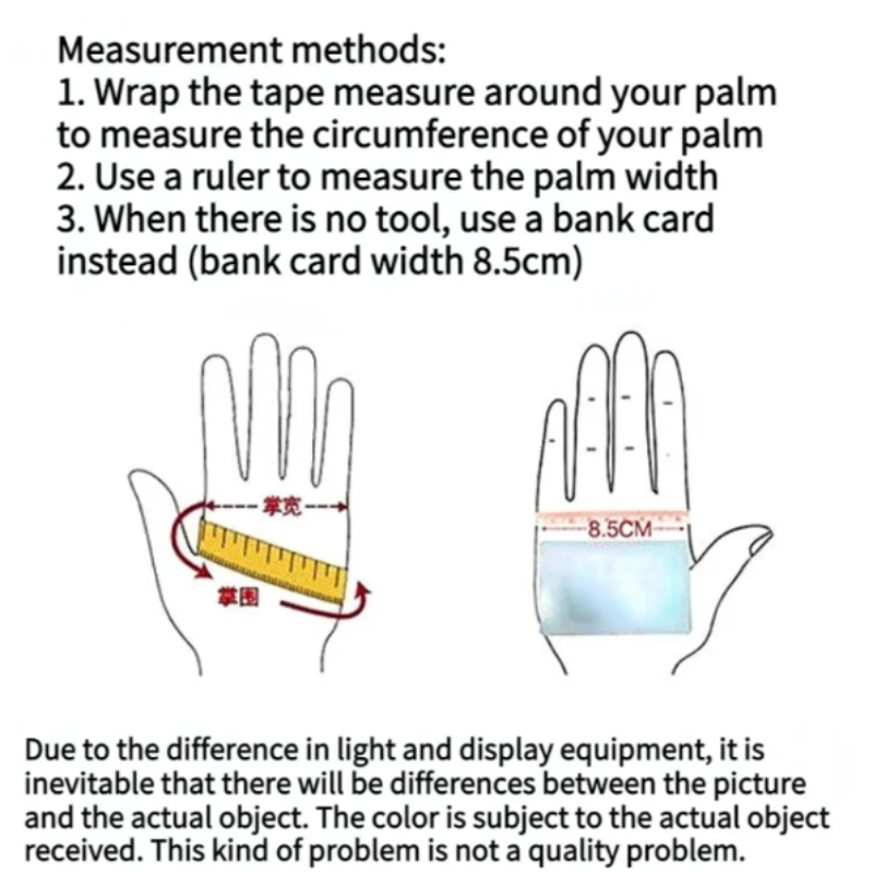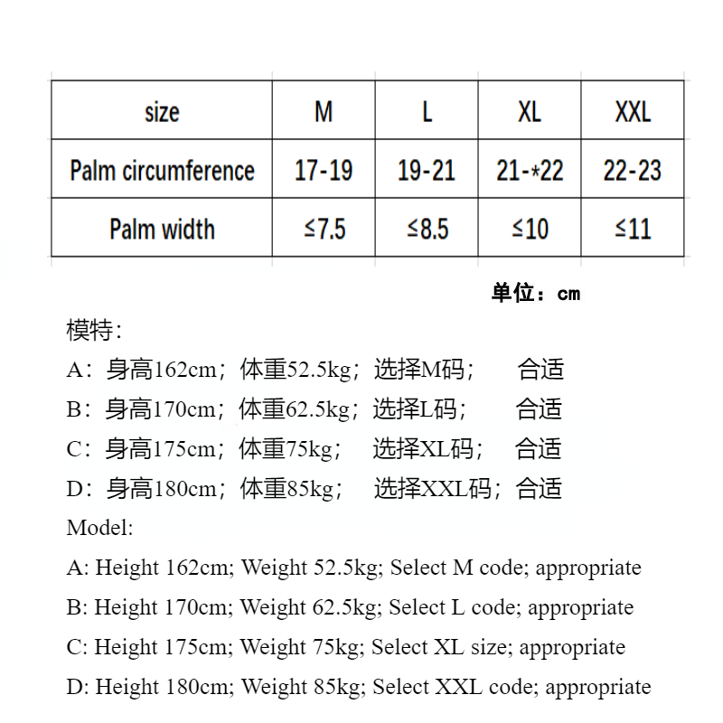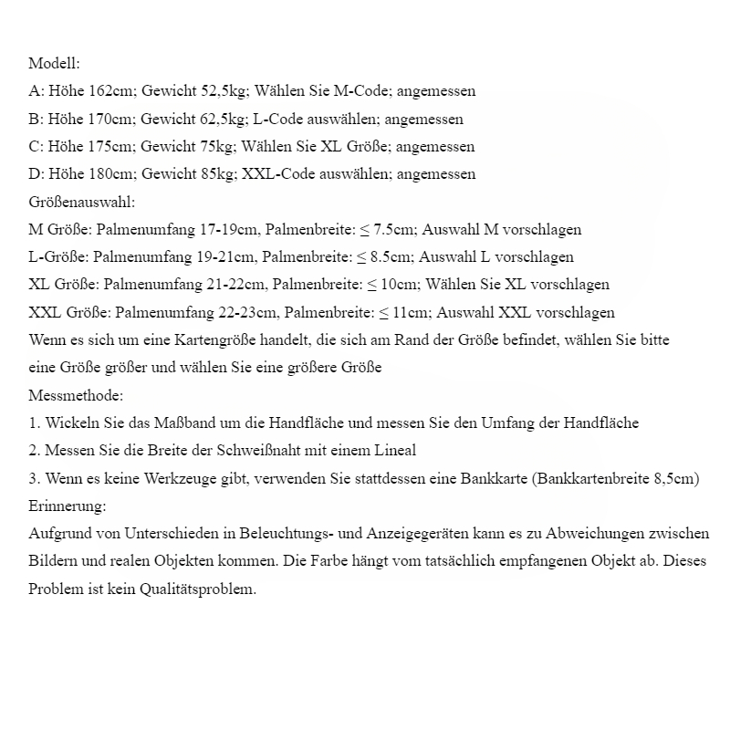 Model:A: Height 162cm; Weight 52.5kg; Select M code; appropriateB: Height 170cm; Weight 62.5kg; Select L code; appropriateC: Height 175cm; Weight 75kg; Select XL size; appropriateD: Height 180cm; Weight 85kg; Select XXL code; appropriateSize selection:M size: palm circumference 17-19cm, palm width: ≤ 7.5cm; Suggest choosing ML size: palm circumference 19-21cm, palm width: ≤ 8.5cm; Suggest choosing LXL size: Palm circumference 21-22cm, Palm width: ≤ 10cm; Suggest choosing XLXXL size: Palm circumference 22-23cm, Palm width: ≤ 11cm; Suggest choosing XXLIf it is a card size, located at the edge of the size, please choose one size larger and choose a larger sizeMeasurement method:1. Wrap the tape measure around the palm and measure the circumference of the palm2. Measure the width of the weld seam with a ruler3. When there are no tools, use a bank card instead (bank card width 8.5cm)reminder:Due to differences in lighting and display devices, there may be some discrepancies between images and real objects. The color depends on the actual received object. This issue is not a quality problem.Modell:A: Höhe 162cm; Gewicht 52,5kg; Wählen Sie M-Code; angemessenB: Höhe 170cm; Gewicht 62,5kg; L-Code auswählen; angemessenC: Höhe 175cm; Gewicht 75kg; Wählen Sie XL Größe; angemessenD: Höhe 180cm; Gewicht 85kg; XXL-Code auswählen; angemessenGrößenauswahl:M Größe: Palmenumfang 17-19cm, Palmenbreite: ≤ 7.5cm; Auswahl M vorschlagenL-Größe: Palmenumfang 19-21cm, Palmenbreite: ≤ 8.5cm; Auswahl L vorschlagenXL Größe: Palmenumfang 21-22cm, Palmenbreite: ≤ 10cm; Wählen Sie XL vorschlagenXXL Größe: Palmenumfang 22-23cm, Palmenbreite: ≤ 11cm; Auswahl XXL vorschlagenWenn es sich um eine Kartengröße handelt, die sich am Rand der Größe befindet, wählen Sie bitte eine Größe größer und wählen Sie eine größere GrößeMessmethode:1. Wickeln Sie das Maßband um die Handfläche und messen Sie den Umfang der Handfläche2. Messen Sie die Breite der Schweißnaht mit einem Lineal3. Wenn es keine Werkzeuge gibt, verwenden Sie stattdessen eine Bankkarte (Bankkartenbreite 8,5cm)Erinnerung:Aufgrund von Unterschieden in Beleuchtungs- und Anzeigegeräten kann es zu Abweichungen zwischen Bildern und realen Objekten kommen. Die Farbe hängt vom tatsächlich empfangenen Objekt ab. Dieses Problem ist kein Qualitätsproblem.