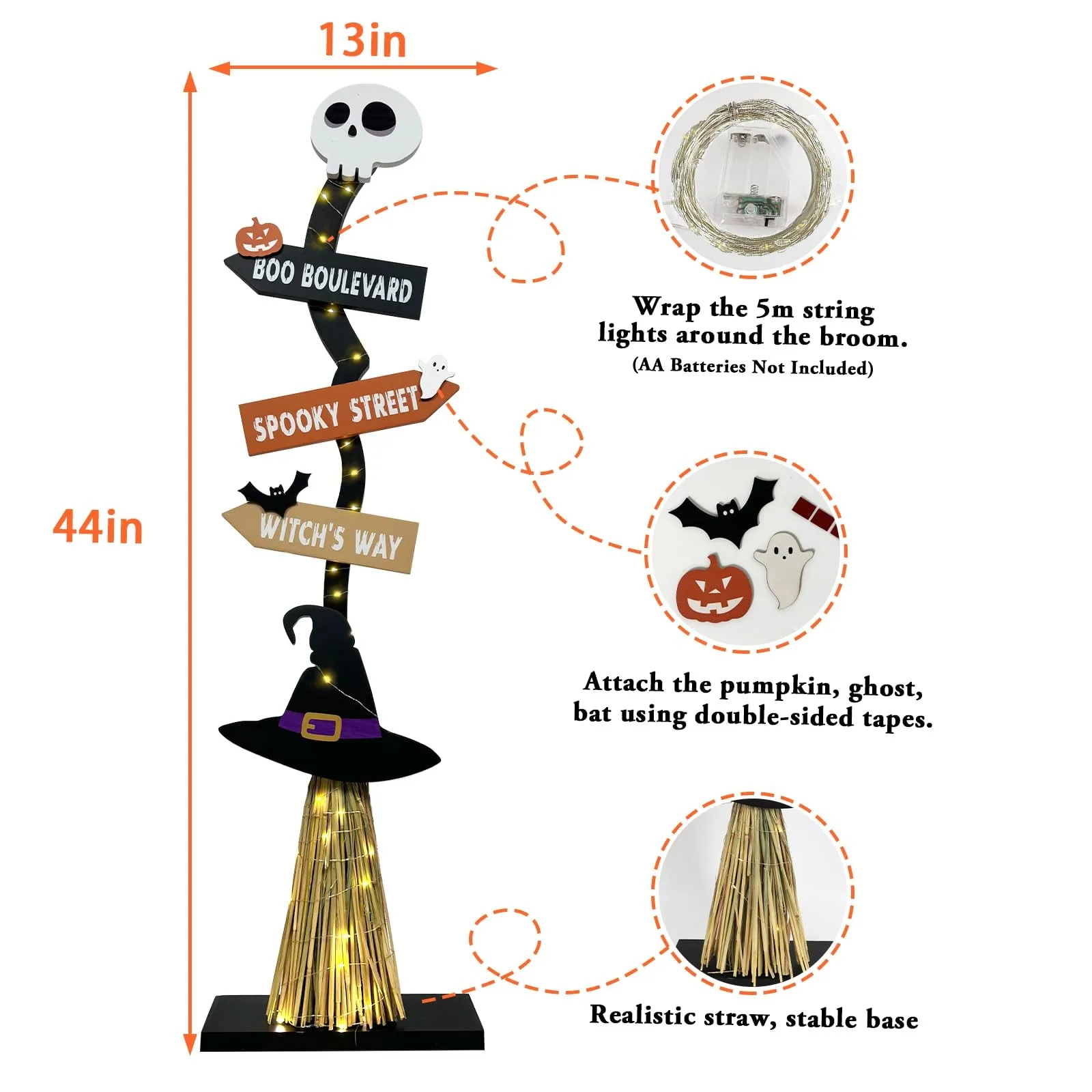 Dettaglio materiale: la deliziosa strega è realizzata in legno e paglia di alta qualità, misura 44 “x 13”. Viene fornito con una base in legno per stabilità e durata. Un sacco di luci calde portano una festa A casa tua.