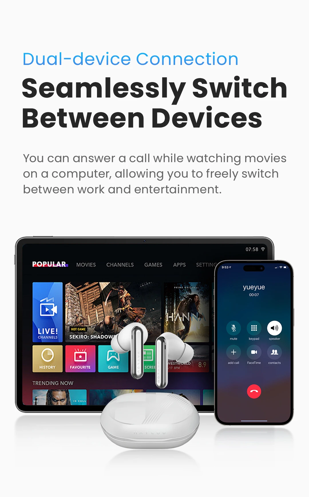 Cancellazione del rumore a 6 microfoni: gli auricolari presenta sei microfoni (tre per auricolari) per eliminare il rumore circostante durante le chiamate, impostare una comunicazione chiara possibile tutti i scenari.