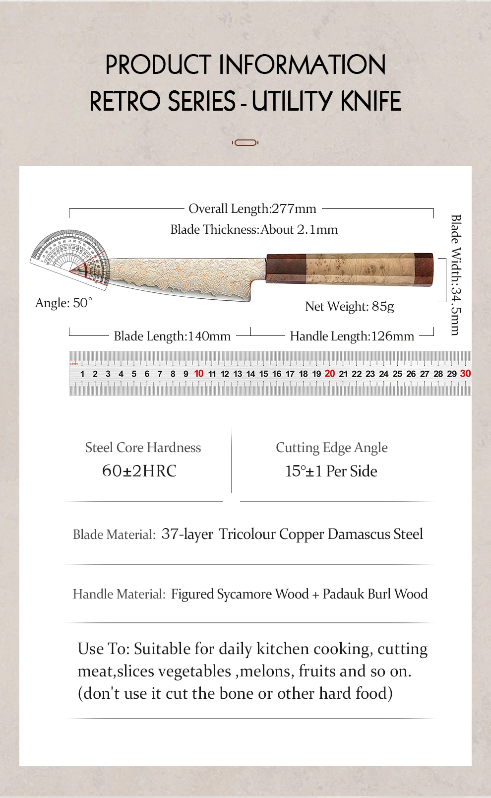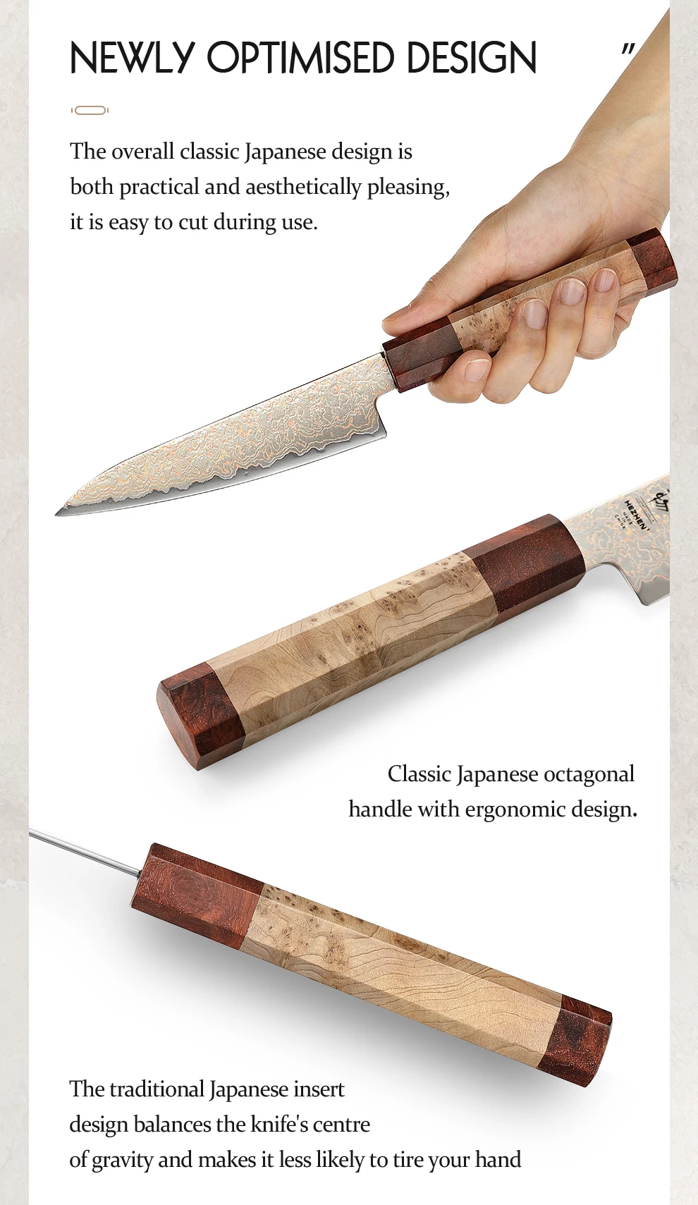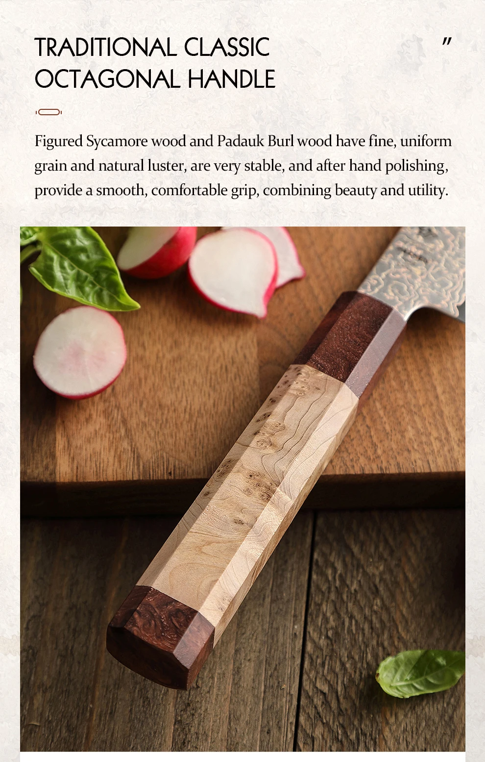Materiale della maniglia: legno di sicomoro figurato + legno di bardana Padauk