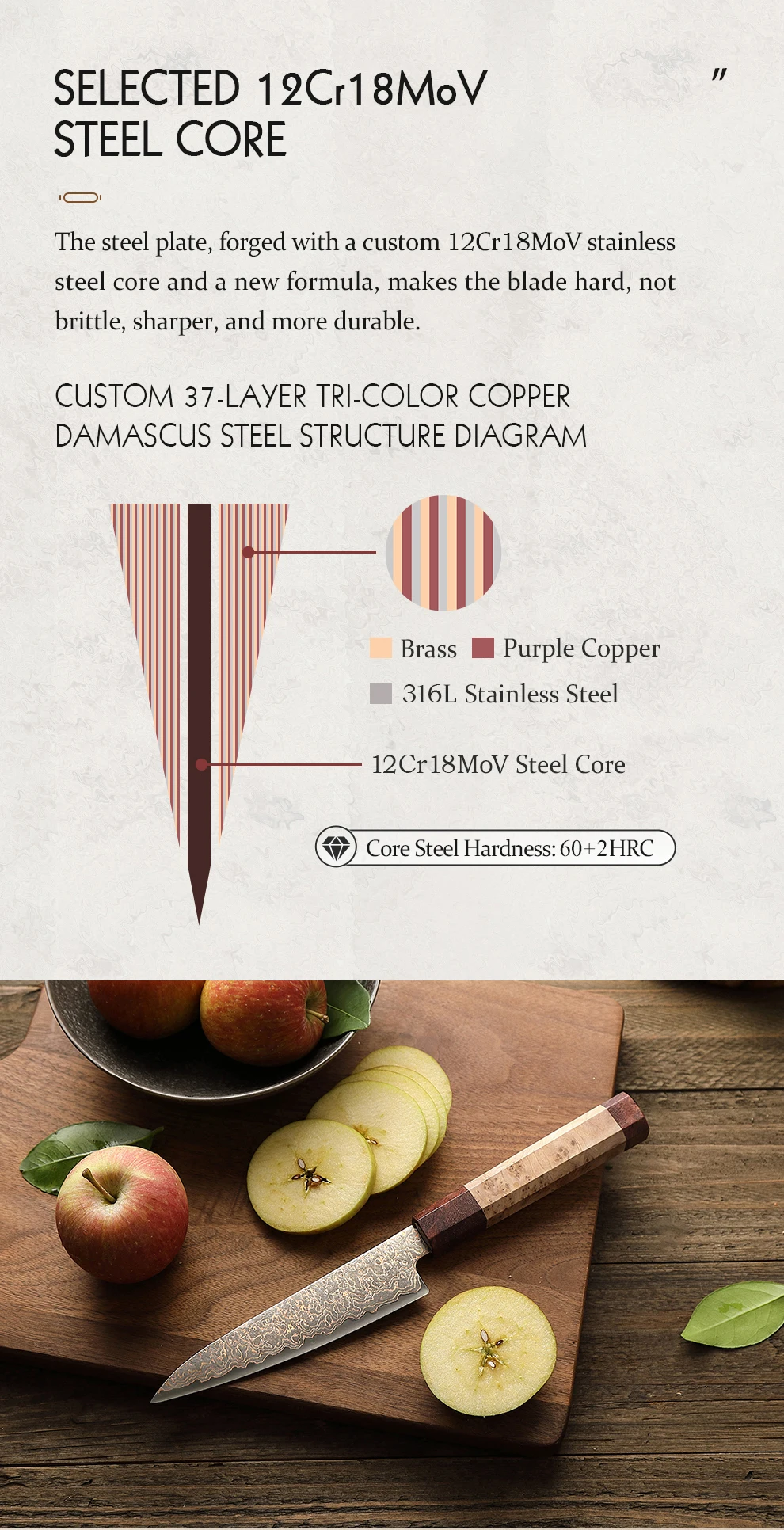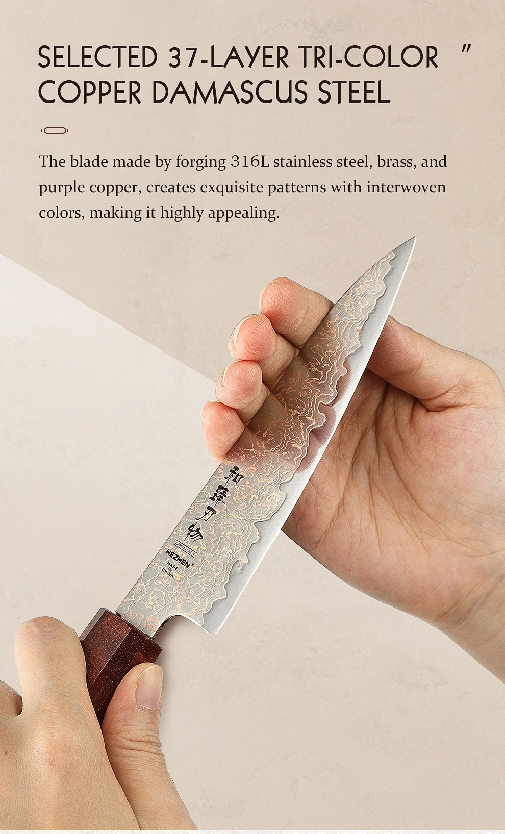 Materiale lama: 37 strati tricolore rame acciaio damasco
