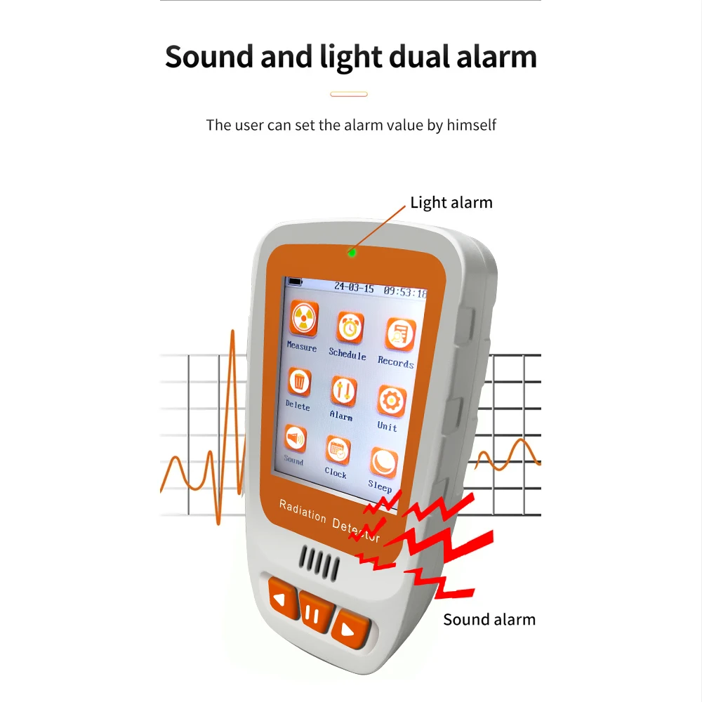 Quando il registratore è commutato e spegnimento, il monitor sveglia automaticamente se la dose delle radiazioni è rilevata sopra il valore dell’allarme del set.Salta automaticamente la pagina di misurazione delle radiazioni.