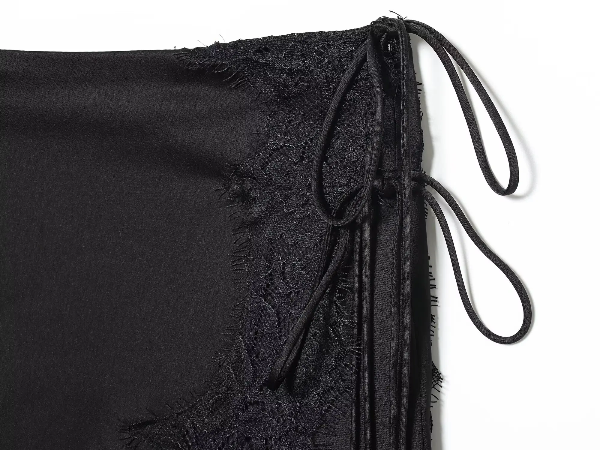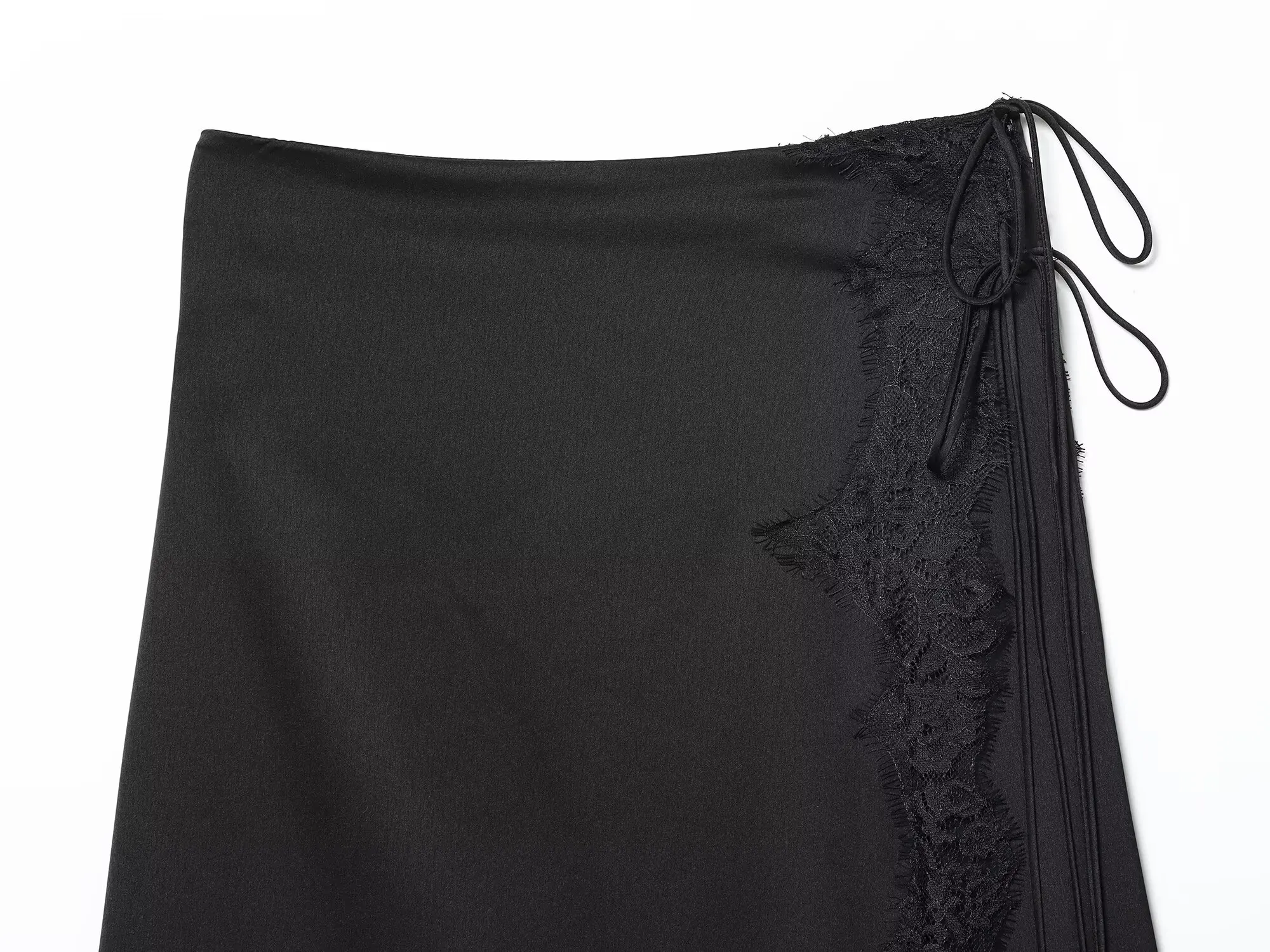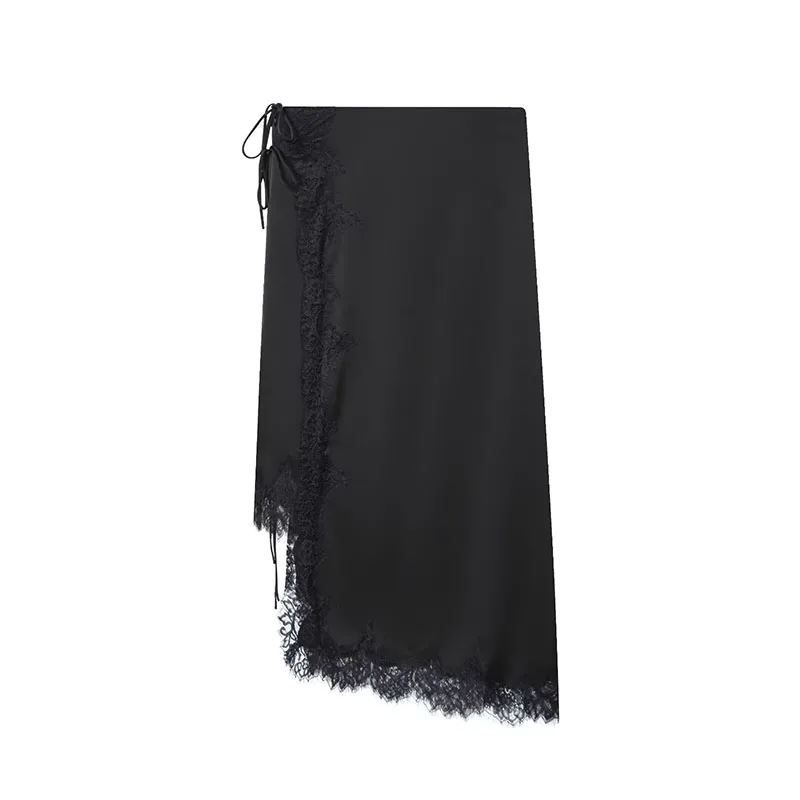 HH Gonna da donna in raso di pizzo nero versatile moda femminile a vita media Temperamento sottile con cerniera Fiocco con lacci Gonna a trapezio asimmetrica