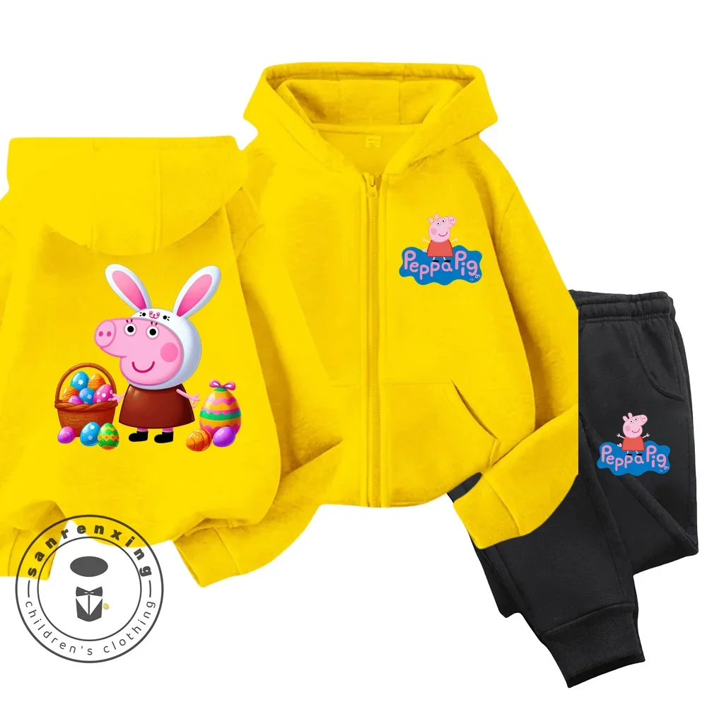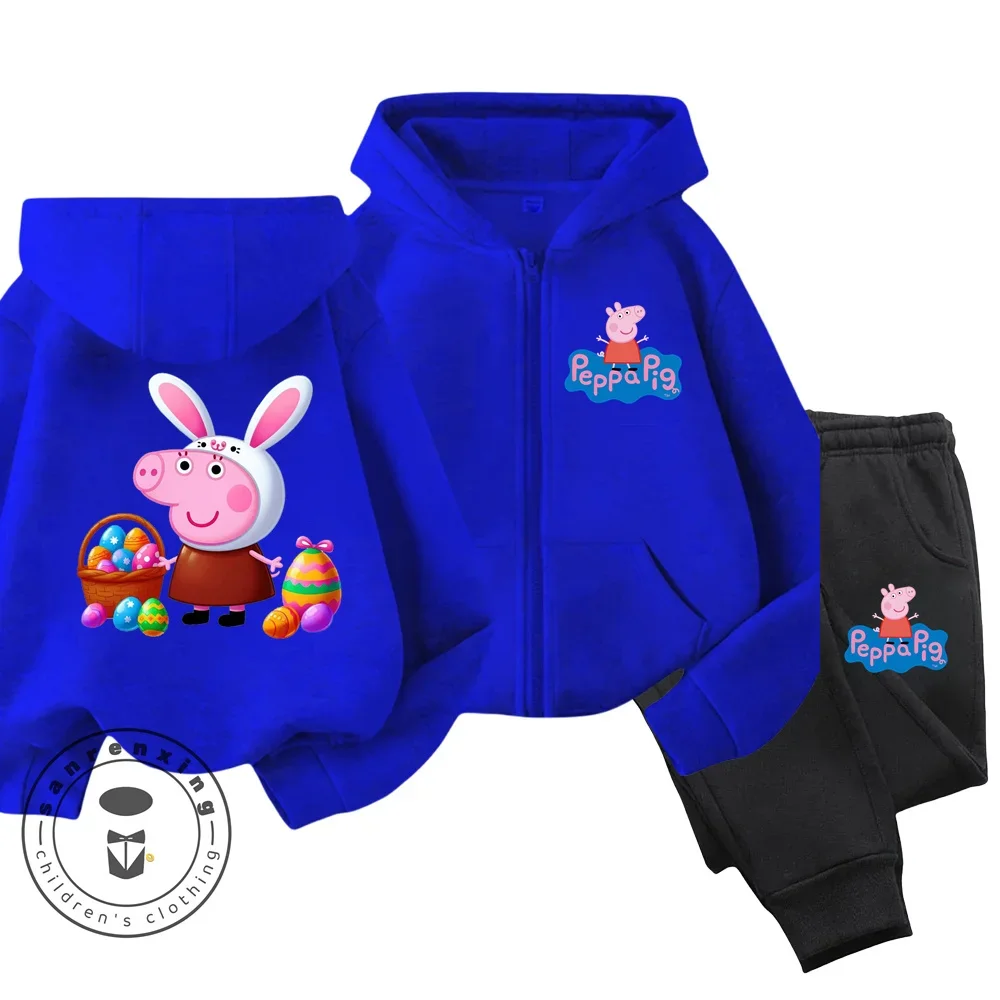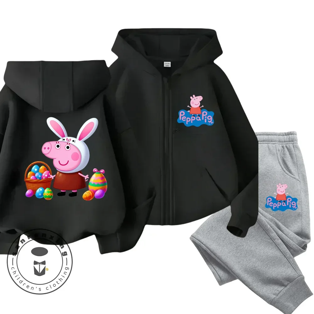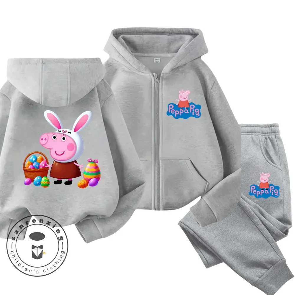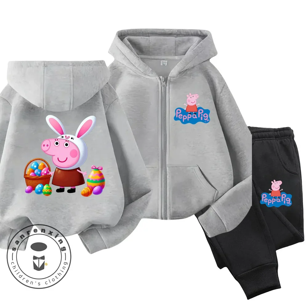 Hot Peppa Pig Abbigliamento Felpa casual per bambini Set con cerniera Set sportivo per bambini Felpa con cappuccio Top + pantaloni Set da 2 pezzi