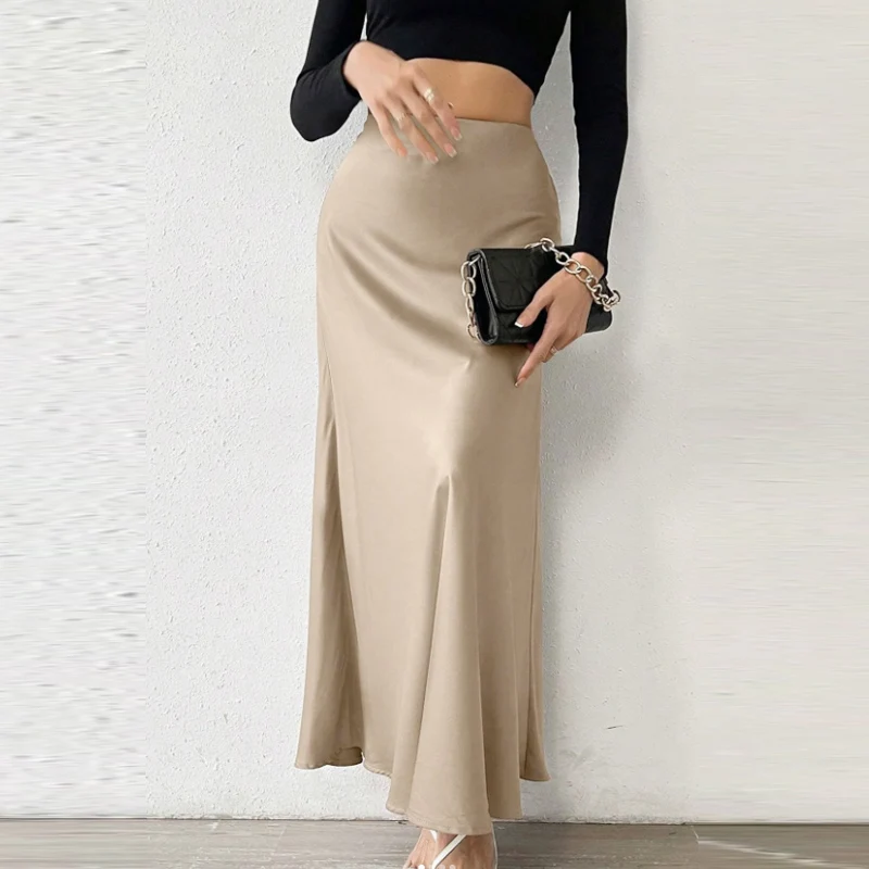 HXAO Gonne lunghe in raso da donna Nero Bianco Verde Gonna kaki Gonne da donna eleganti estive Gonne a vita alta lisce di lusso 066