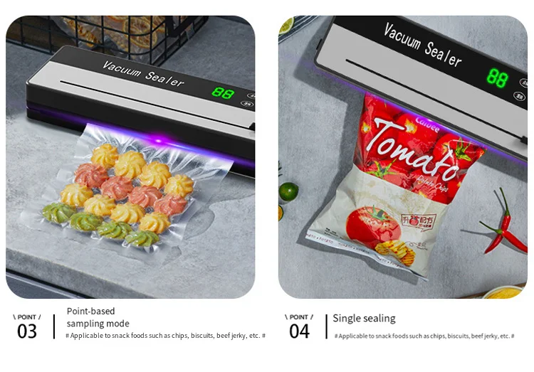 • Molteplici modalità di sigillatura – Dotato di tre modalità versatili: modalità pompa a secco per vuoto, modalità pompa a punti e sigillatura individuale – ideale per sigillare una varietà di tipi di alimenti, tra cui carne, frutti di mare, prodotti secchi, frutta, verdura e prodotti per prelibatezze.