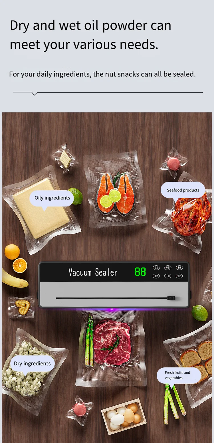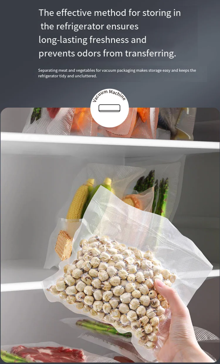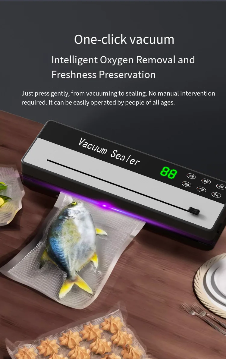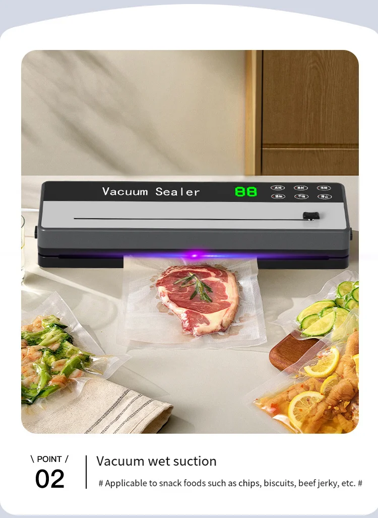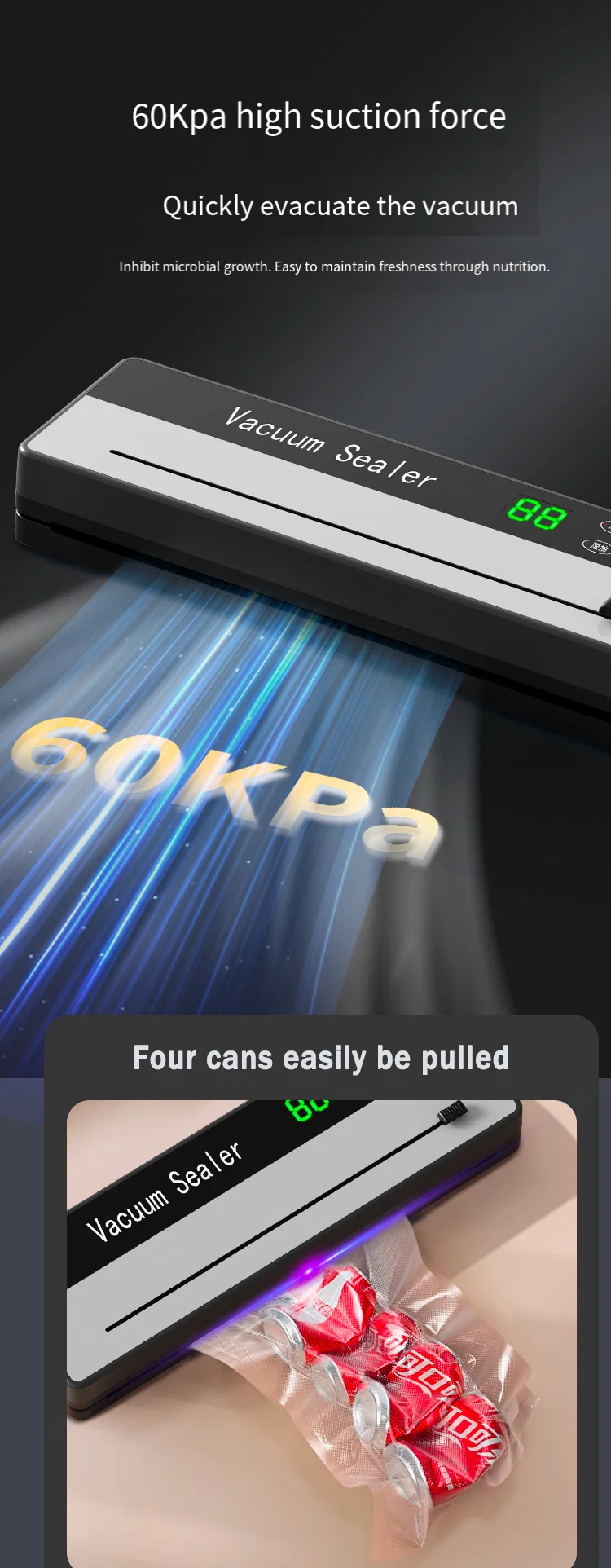 • Aspirazione potente e alta efficienza – La macchina per sottovuoto ha una potente potenza di aspirazione di 60Kpa, che garantisce che l’aria nei sacchetti per la conservazione degli alimenti venga estratta rapidamente e completamente, mantenendo una freschezza ottimale e prevenendo il deterioramento.