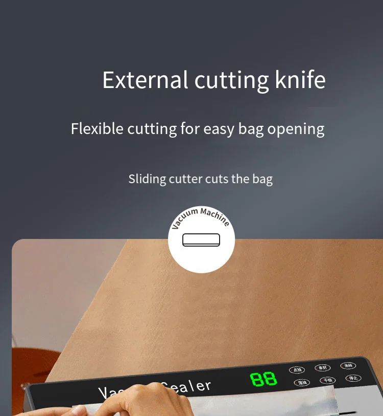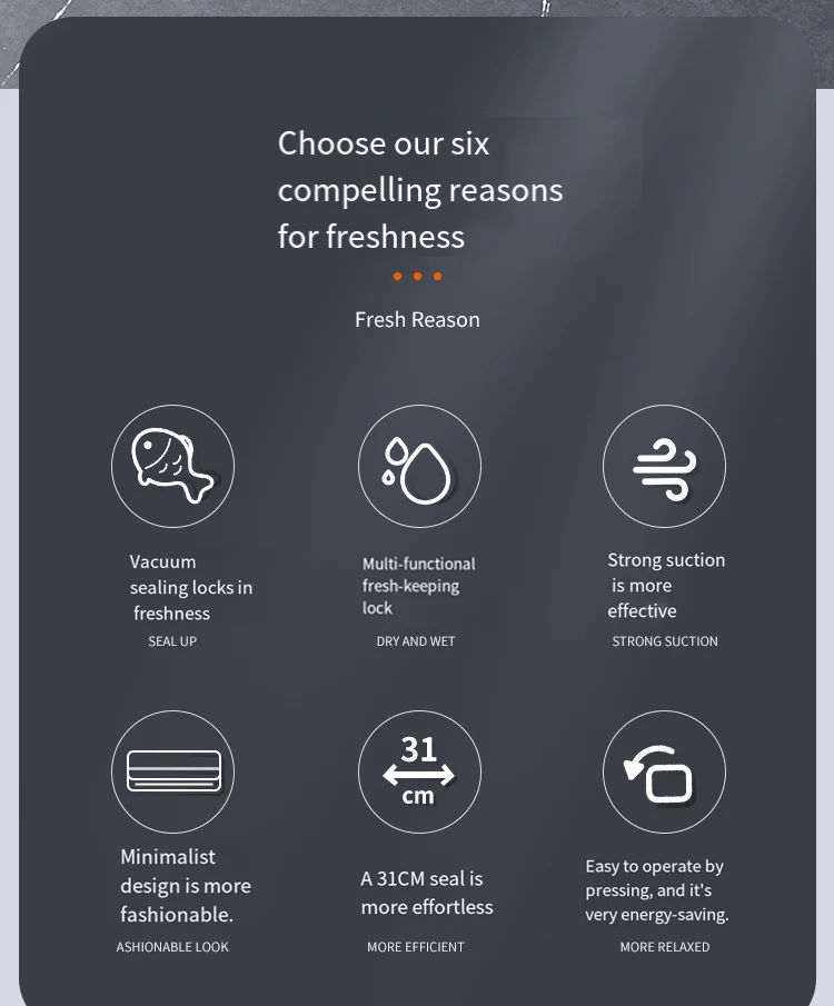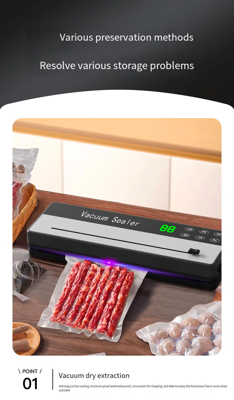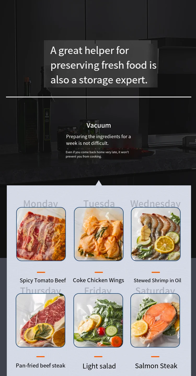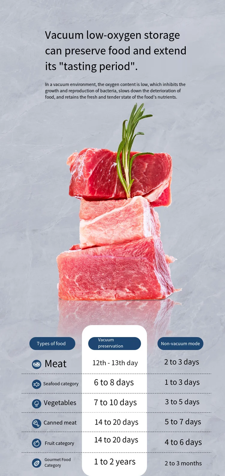 • Aspirazione potente e alta efficienza – La macchina per sottovuoto ha una potente potenza di aspirazione di 60Kpa, che garantisce che l’aria nei sacchetti per la conservazione degli alimenti venga estratta rapidamente e completamente, mantenendo una freschezza ottimale e prevenendo il deterioramento.