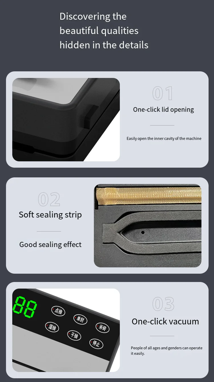 • Funzionamento semplice con un solo tocco – Questa macchina per sottovuoto è progettata per essere facile da usare, con un avvio rapido con una sola pressione, rendendola adatta a utenti di tutte le età, compresi anziani e bambini supervisionati.