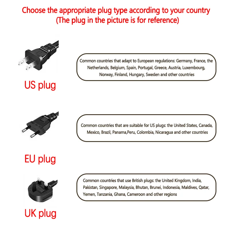 3.Questo prodotto ha tre tipi di spina, vale a dire: Standard americano, Standard britannico, e Norma europea.Scegli il tipo di spina appropriato in base alla situazione del tuo paese.Prima di effettuare un ordine, assicurati di verificare se hai acquistato il tipo di spina sbagliato per evitare errori inutili. (Il tipo di spina e alcuni paesi applicabili sono stati visualizzati nella pagina dei dettagli. La spina nell’immagine è solo di riferimento)