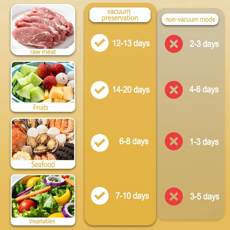 • Aspirazione potente e alta efficienza – La macchina per sottovuoto ha una potente potenza di aspirazione di 60Kpa, che garantisce che l’aria nei sacchetti per la conservazione degli alimenti venga estratta rapidamente e completamente, mantenendo una freschezza ottimale e prevenendo il deterioramento.