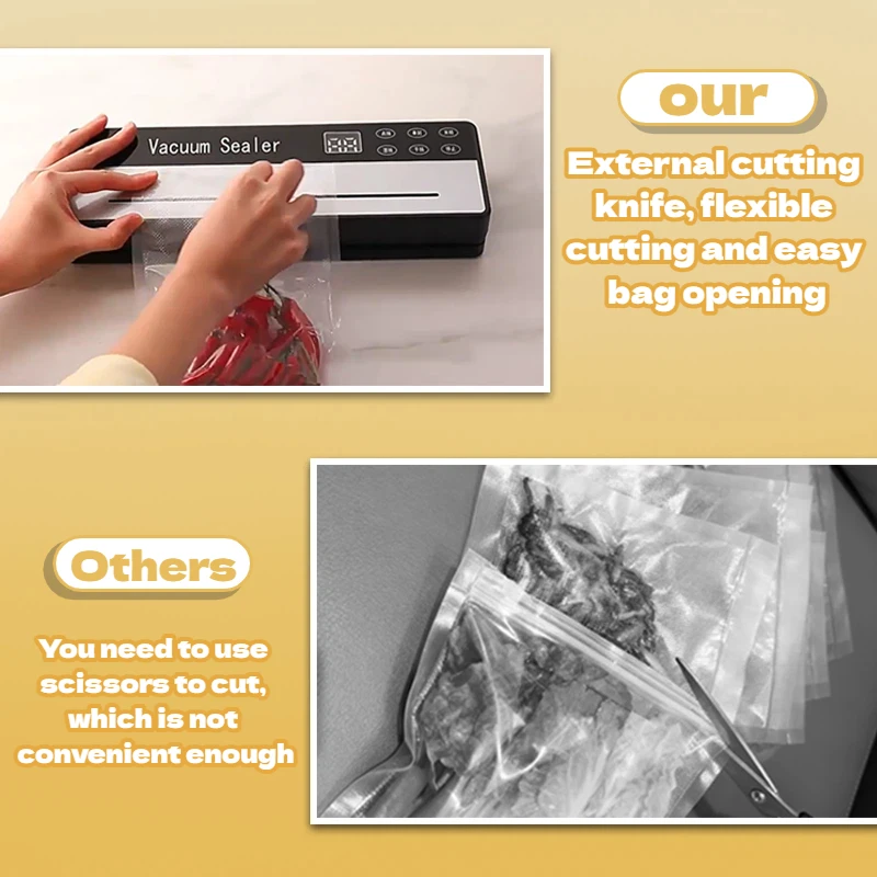 • Lunghezza di sigillatura estesa e sigillatura in confezione multipla – La striscia di sigillatura estesa fino a 31 cm consente di sigillare più confezioni di alimenti contemporaneamente, risparmiando tempo e fatica preziosi durante la conservazione degli alimenti.