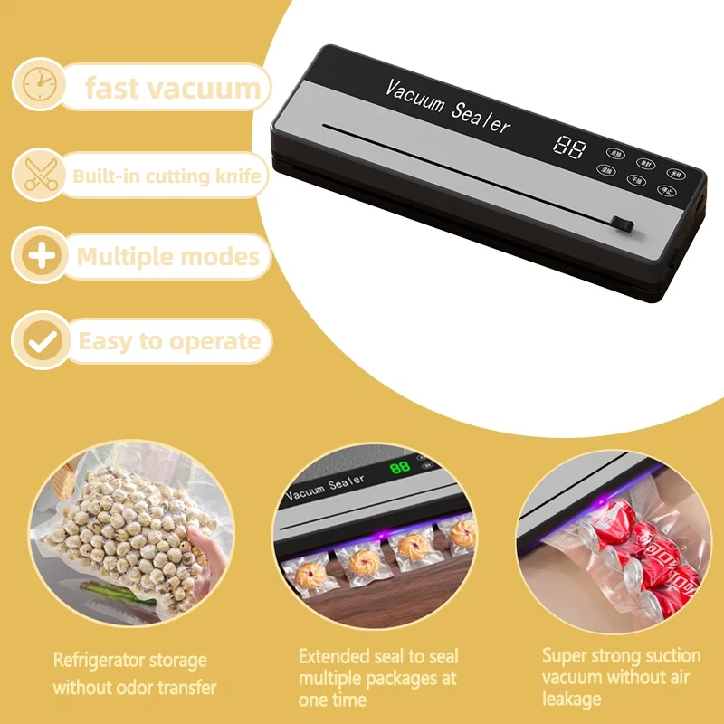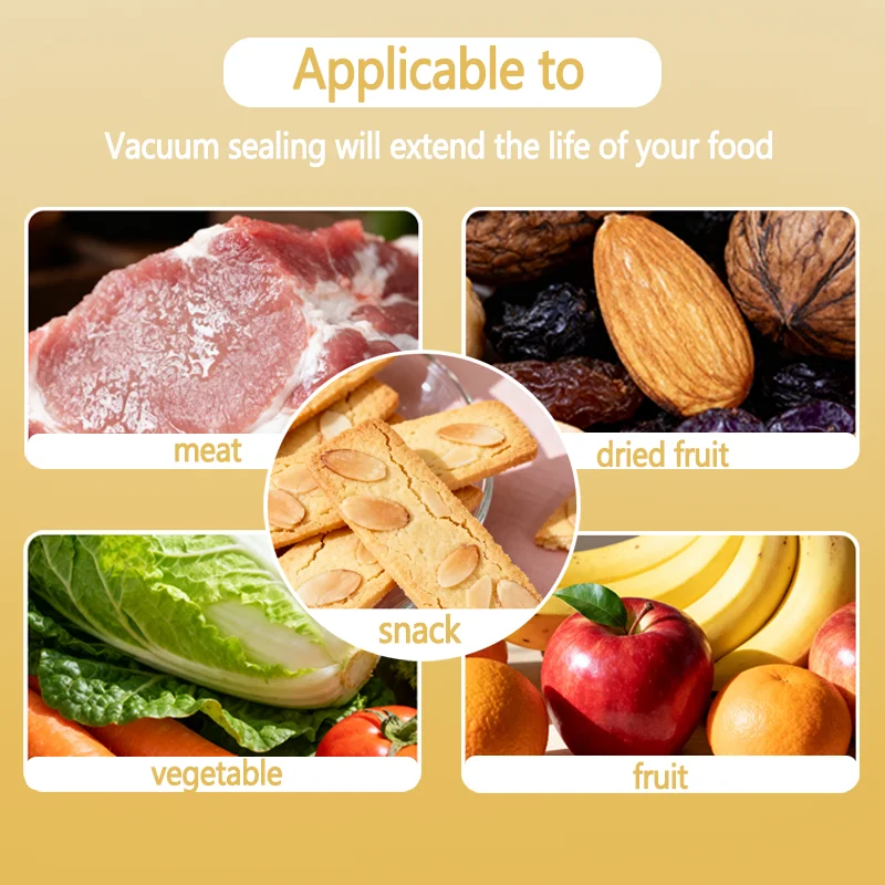 • Molteplici modalità di sigillatura – Dotato di tre modalità versatili: modalità pompa a secco per vuoto, modalità pompa a punti e sigillatura individuale – ideale per sigillare una varietà di tipi di alimenti, tra cui carne, frutti di mare, prodotti secchi, frutta, verdura e prodotti per prelibatezze.