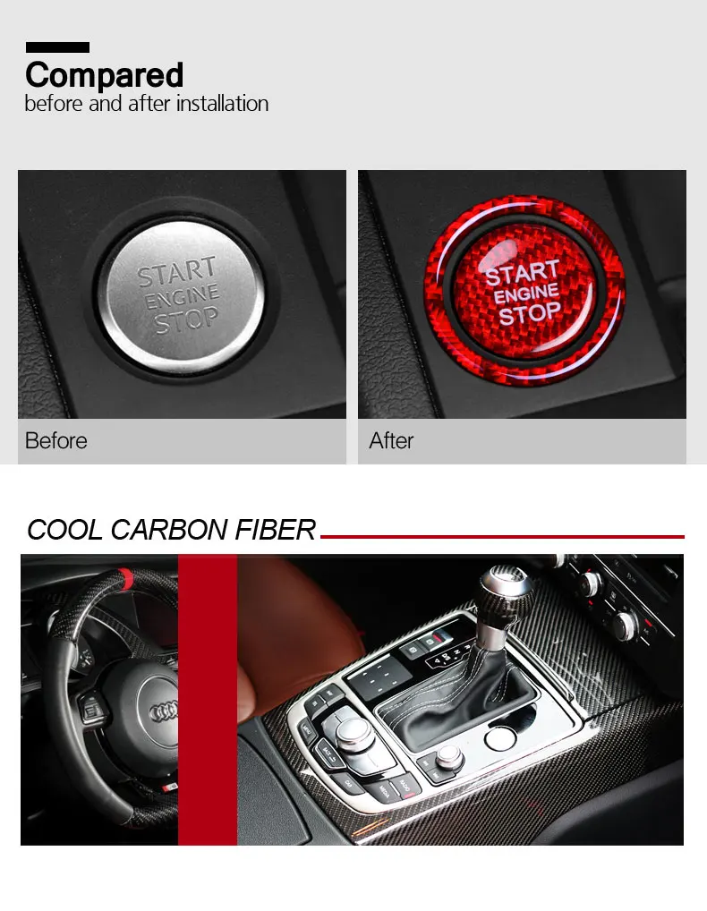Si prega di verificare se è applicabile al modello della vostra auto prima di effettuare un ordine.Modello: per AudiNota: per guida a sinistra/guida a destraMateriali: resina+fibra di carbonioCaratteristiche:1. Realizzato in fibra di carbonio, leggero, antiruggine, resistente al colore e durevole.2. Realizzato come stampo originale, eccellente montaggio e qualità.3. Resistente all’acqua, di lunga durata. Fornisce un’ottima protezione per la tua auto.Passaggi di installazione:1.Pulisci le particelle fini e la polvere sulla superficie del pannello dell’auto e controlla la posizione dell’adesivo e la superficie del pannello.2.Pulisci il promotore di adesione sul retro del prodotto, allinea la posizione e incollala.3. Premere con forza per adattare meglio l’adesivo al pannello.