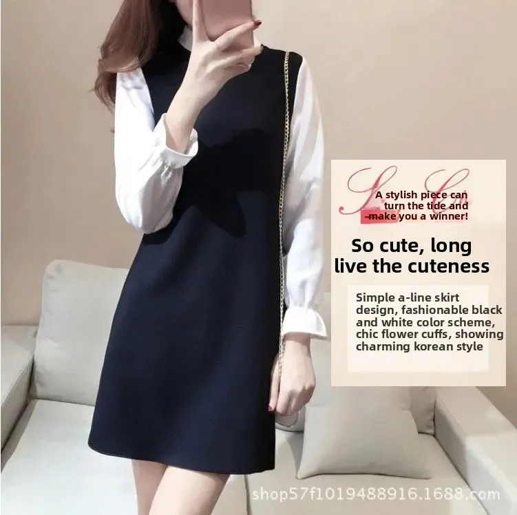 Inizio autunno sottile allentato dimagrante manica lunga strato base abito da donna falso in due pezzi stile coreano gonna a trapezio taglie forti