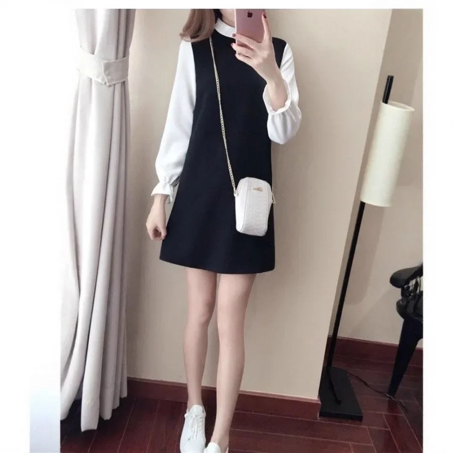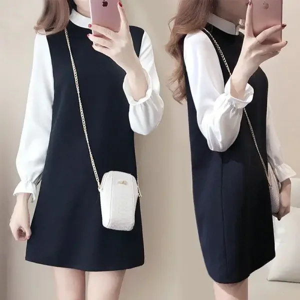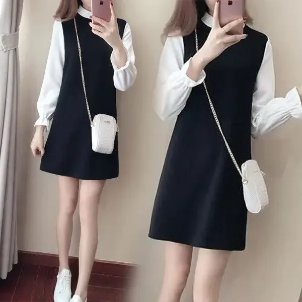 Inizio autunno sottile allentato dimagrante manica lunga strato base abito da donna falso in due pezzi stile coreano gonna a trapezio taglie forti 1Inizio autunno sottile allentato dimagrante manica lunga strato base abito da donna falso in due pezzi stile coreano gonna a trapezio taglie forti