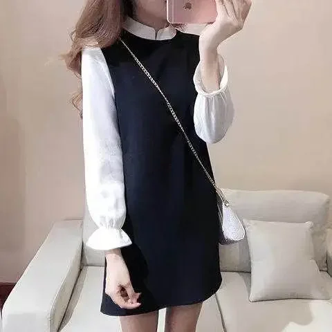 Inizio autunno sottile allentato dimagrante manica lunga strato base abito da donna falso in due pezzi stile coreano gonna a trapezio taglie forti