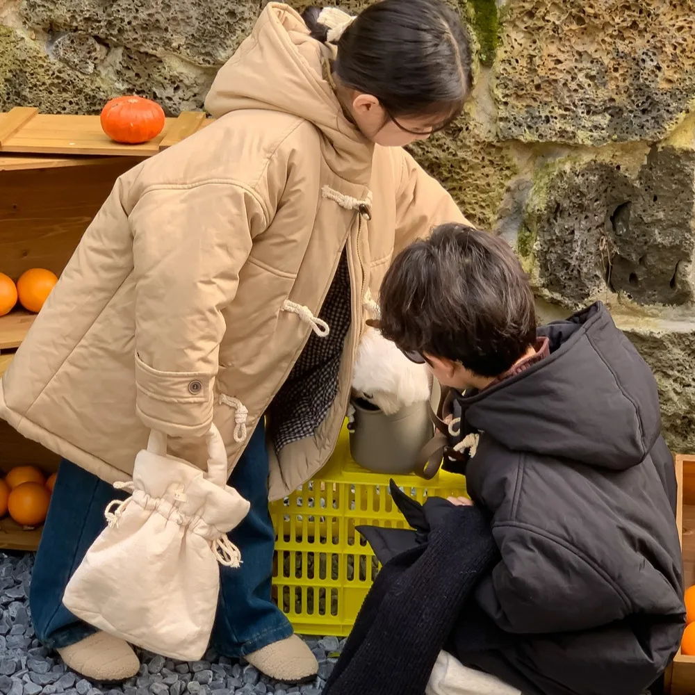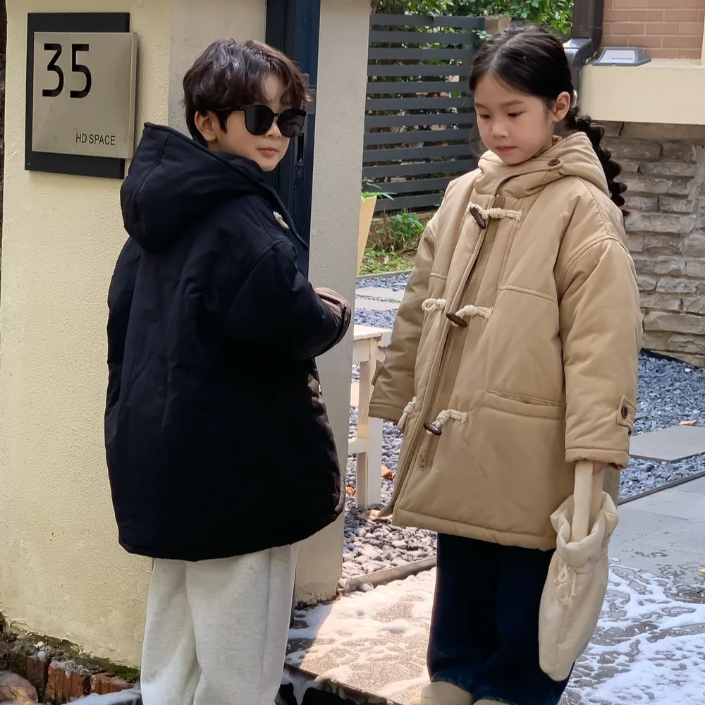Inverno coreano bambini ragazzo parka cotone imbottito addensare con cappuccio bambino ragazzo cappotto da neve casual bottone in corno solido giacca da ragazzo per bambini