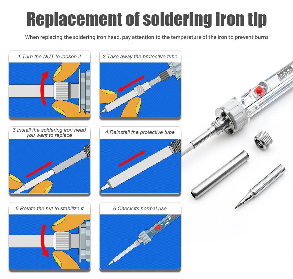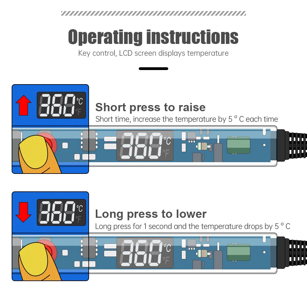 Questa stazione compatta progettata è ideale per uso professionale.La saldatura può essere interpretata e regolata dal manopola di controllo da 180°C – 500°C. Le punte intercambiabili placcate in ferro sono disponibili per realizzare la stazione di saldatura eccellenti per uso elettronico ed elettrico.