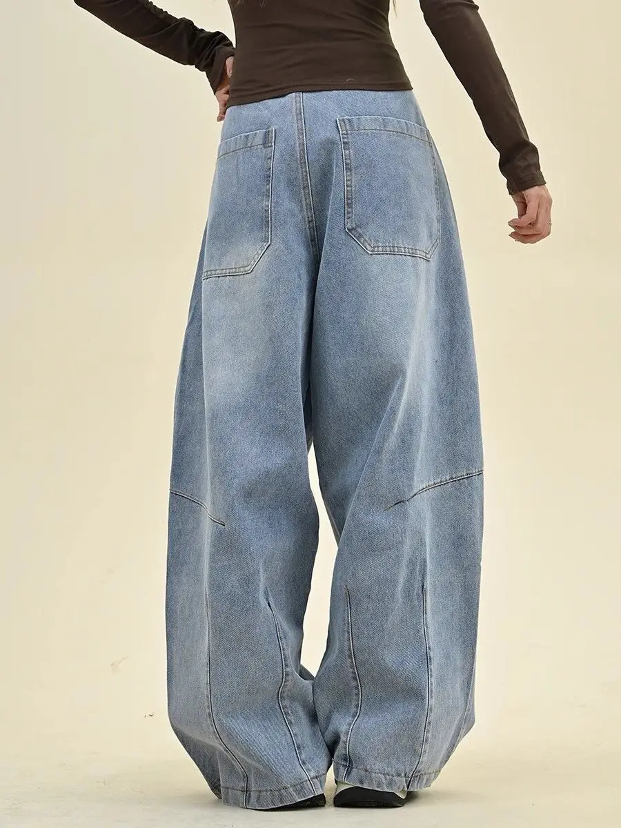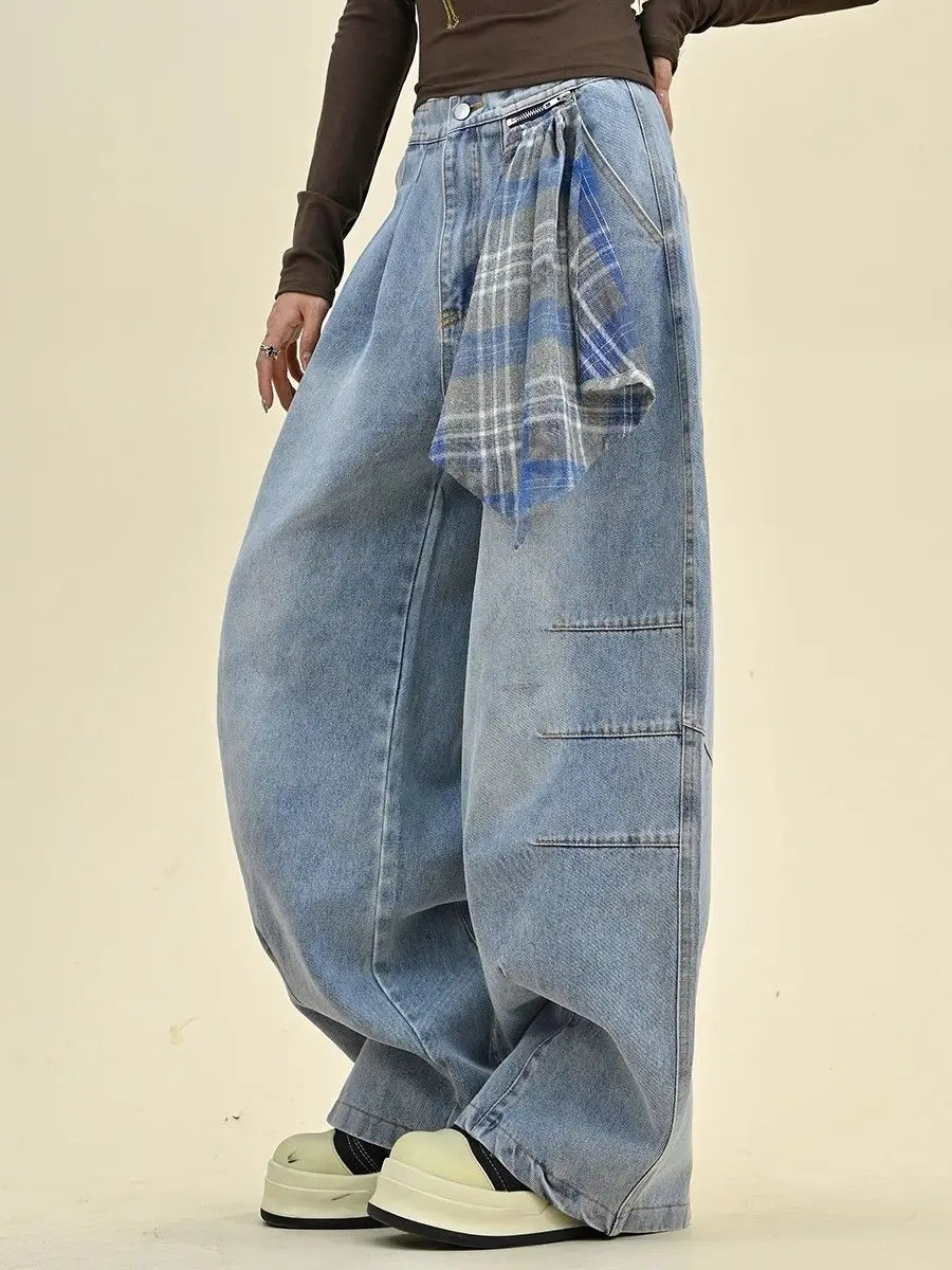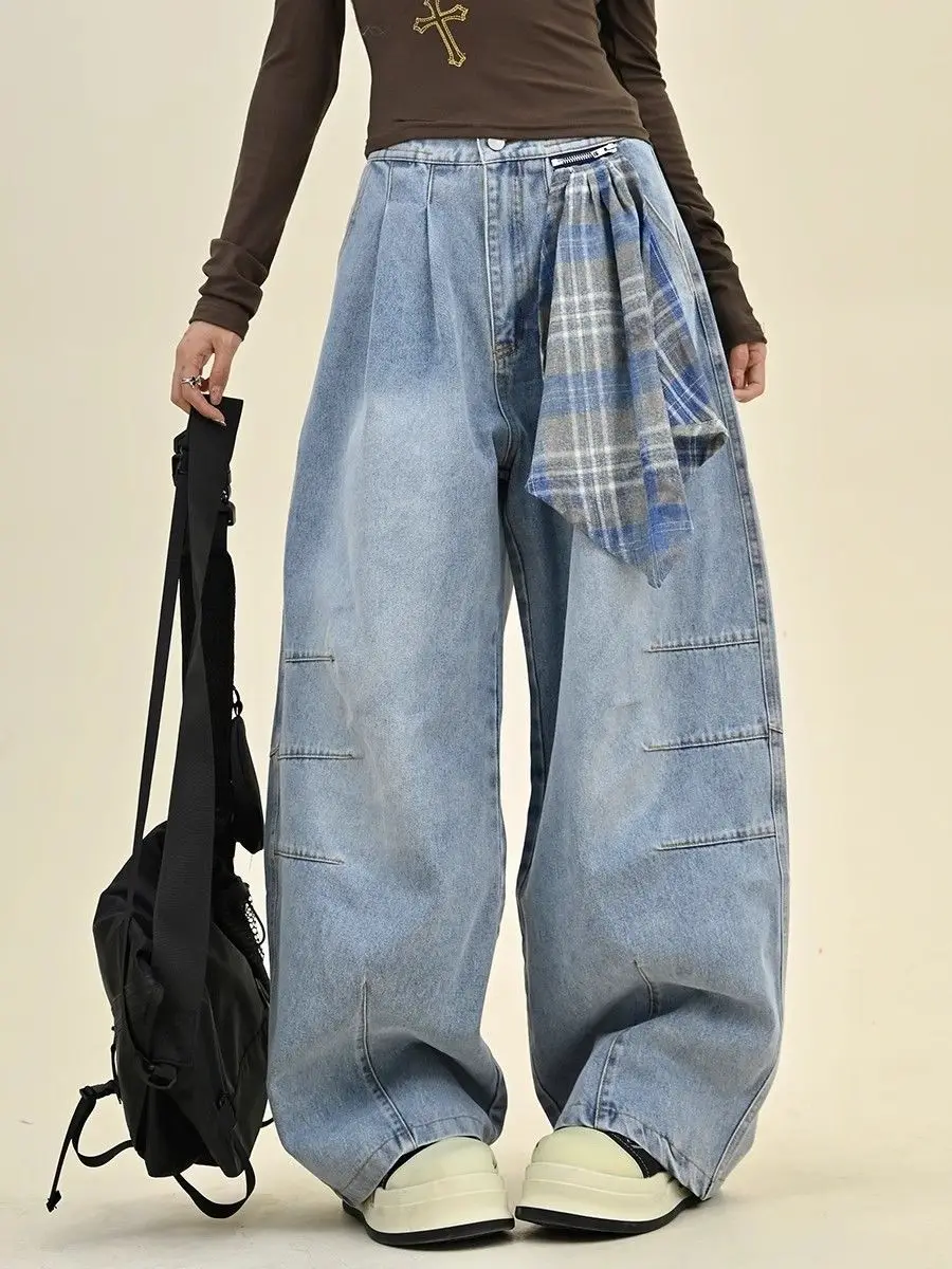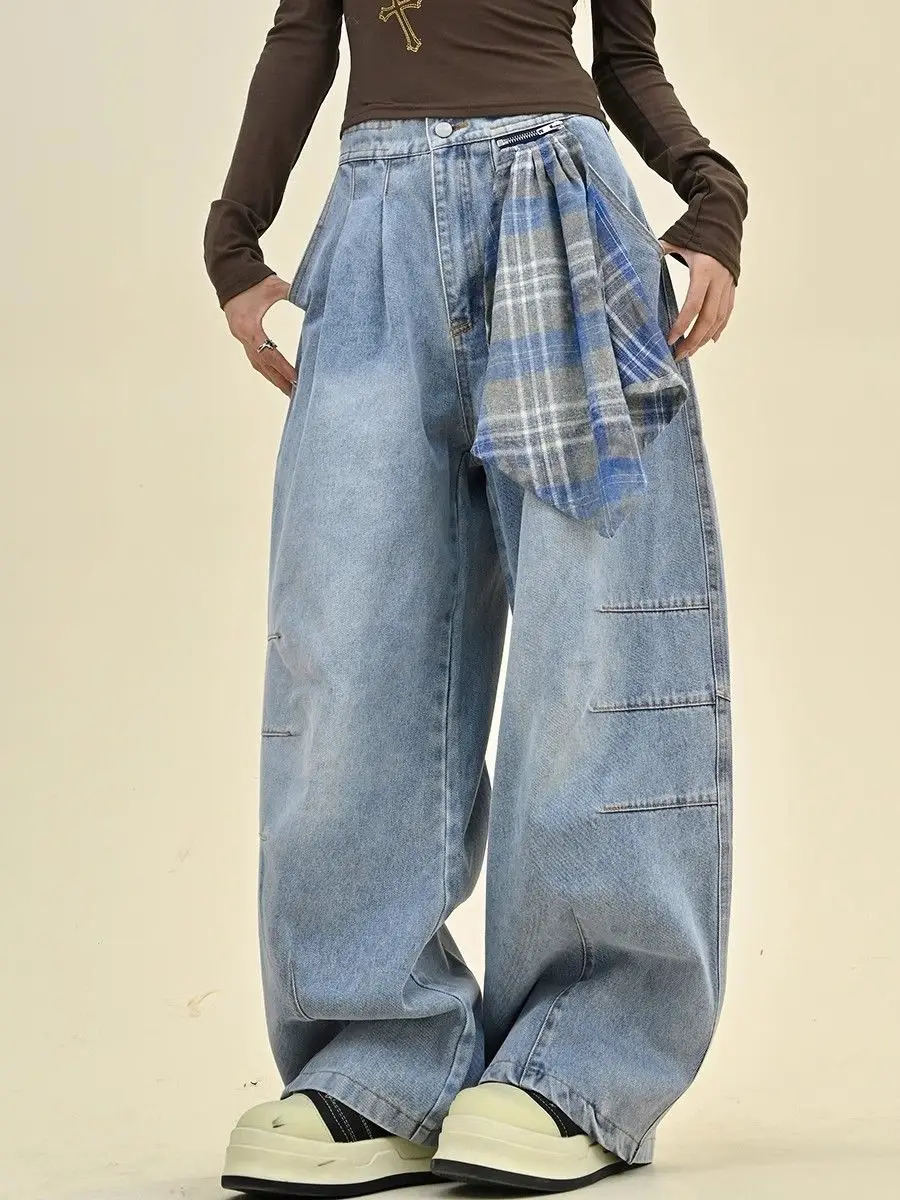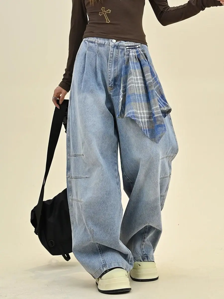 Jeans americani taglie forti per il design autunnale e invernale da donna, silhouette con sciarpa quadrata staccabile, pantaloni larghi a gamba larga