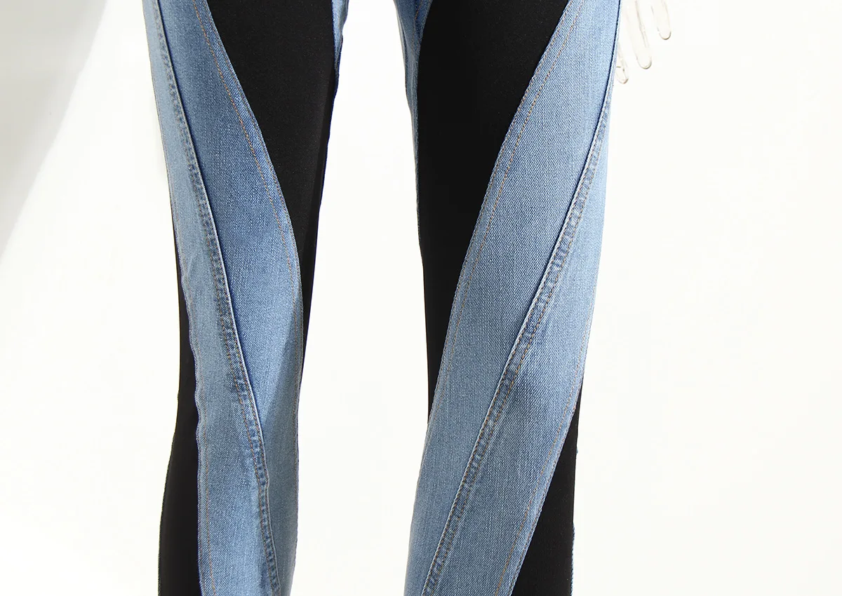 Jeans da donna a blocchi di colore firmati Slim Decostruisci con pannelli patchwork a vita alta Pantaloni lunghi in denim blu divisi Autunno