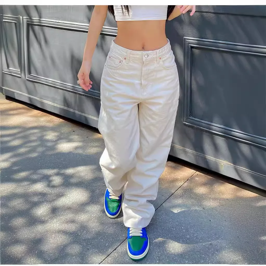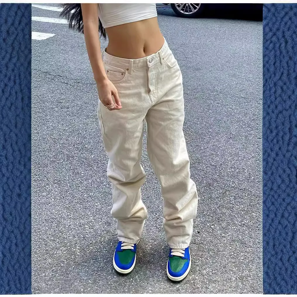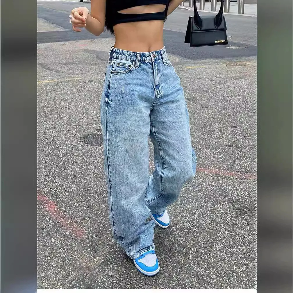Jeans da donna a figura intera Pantaloni dritti in denim effetto invecchiato solido Tasche Allentate Casual a vita media Nozioni di base Cerniera Lavaggio piatto