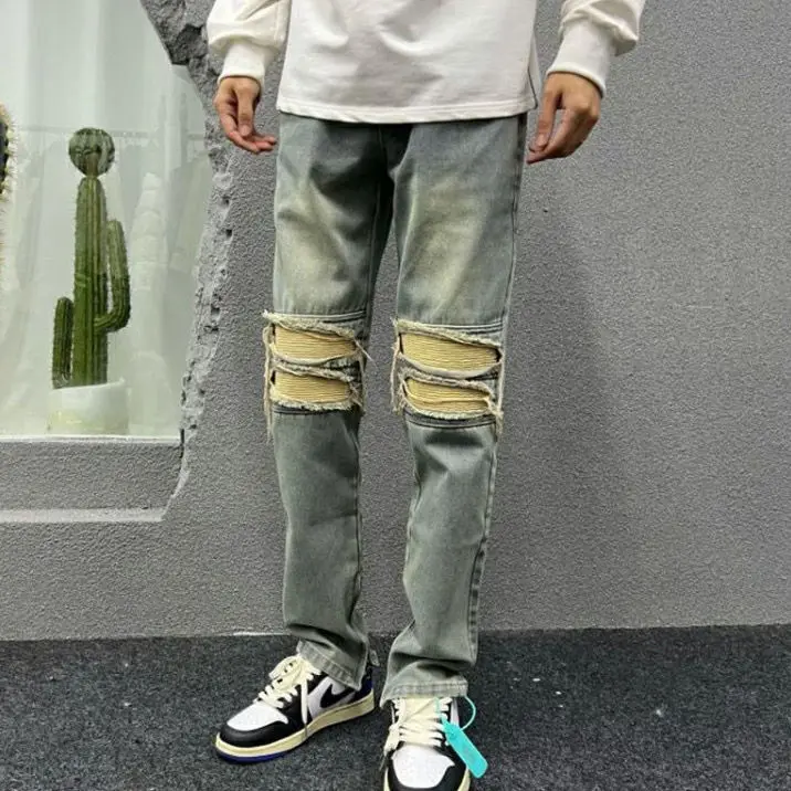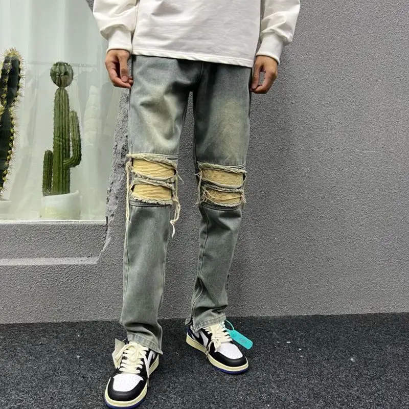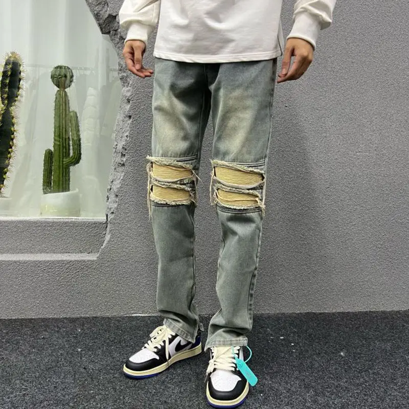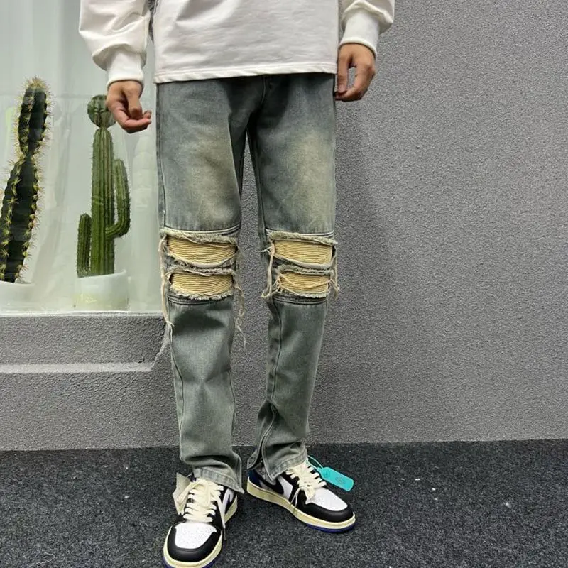 Jeans da uomo in Denim invecchiato primavera autunno Casual allentato coreano cerniera gamba larga mendicante pantaloni Cargo da uomo pantaloni in cotone retrò