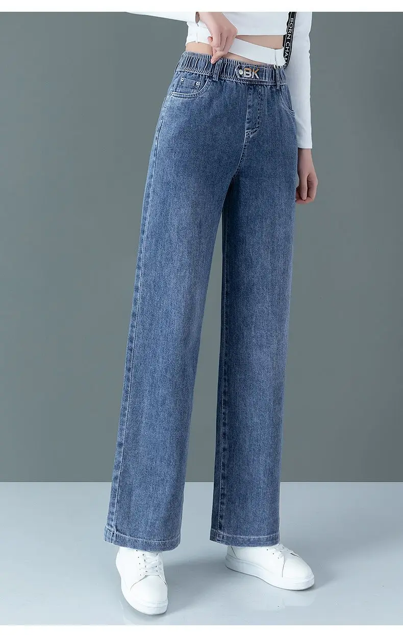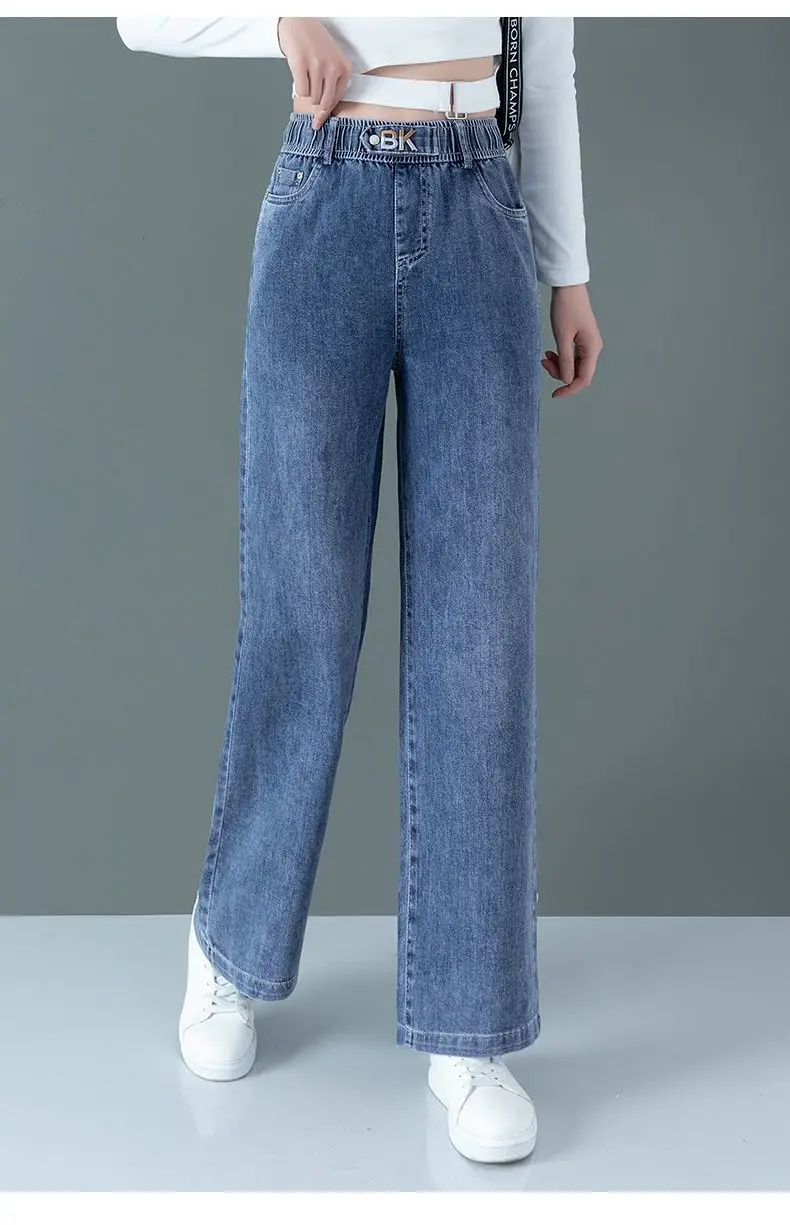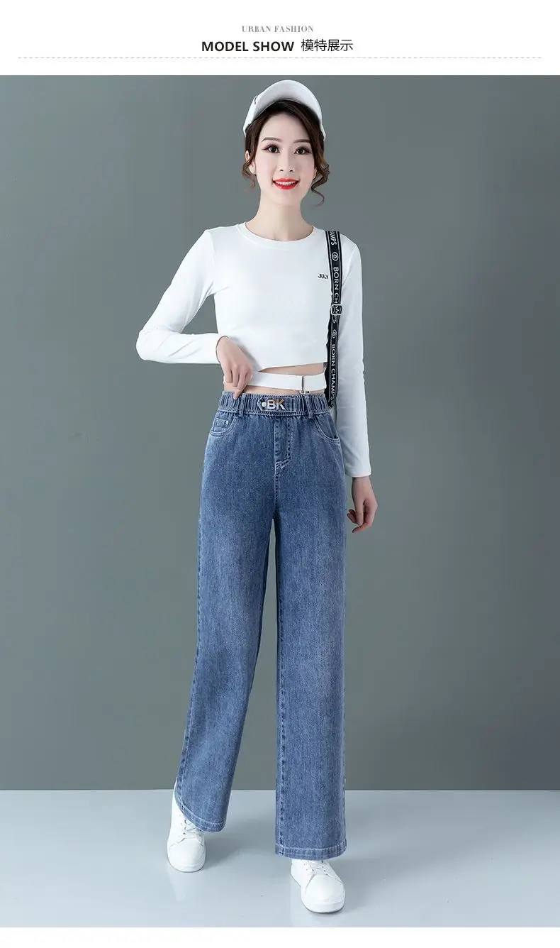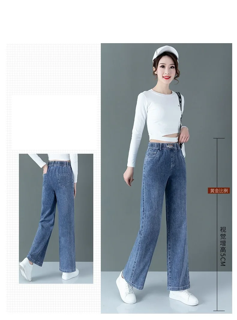 Jeans elastici a vita alta blu Abbigliamento donna 2025 Primavera Autunno Nuovi pantaloni larghi a gamba dritta Pantaloni casual in denim a gamba larga