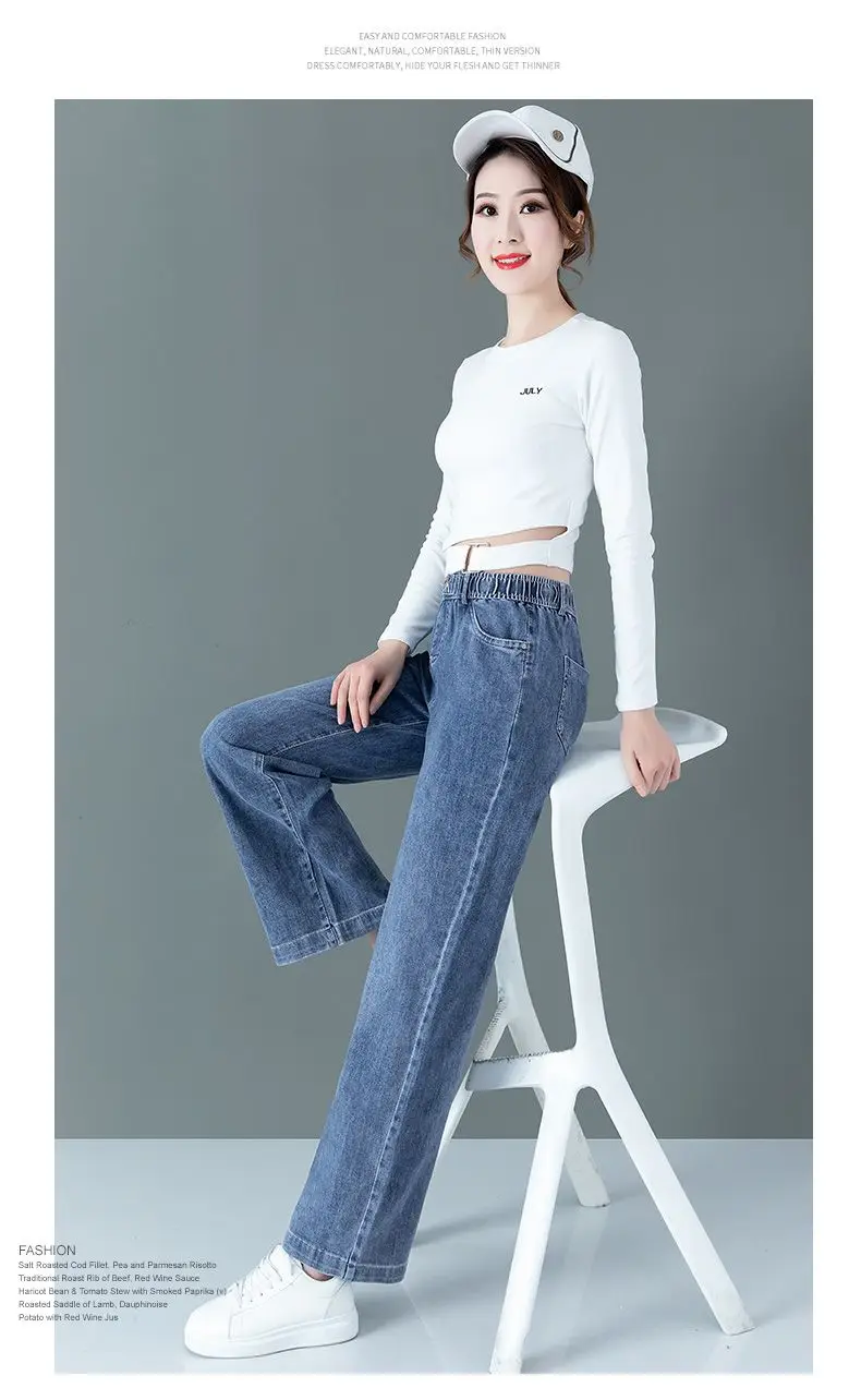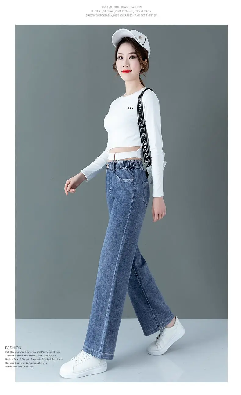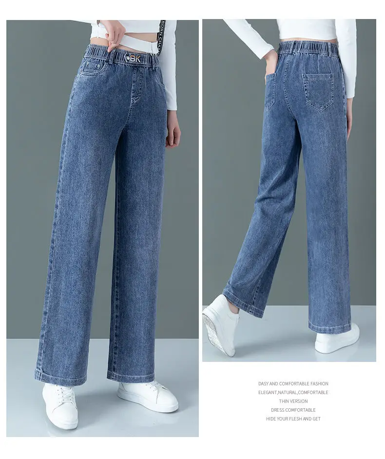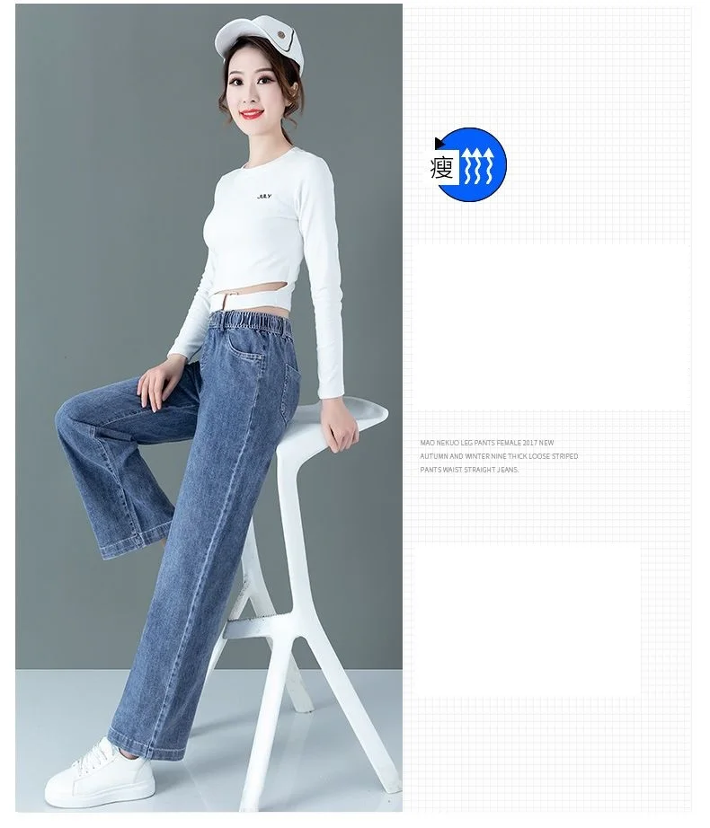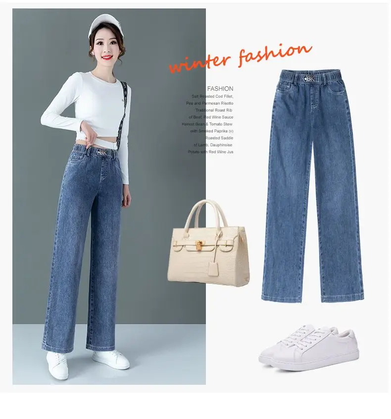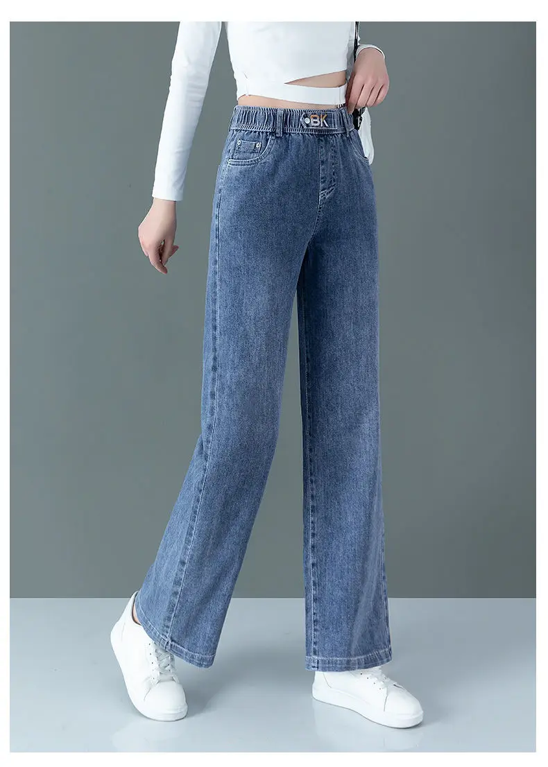 Jeans elastici a vita alta blu Abbigliamento donna 2025 Primavera Autunno Nuovi pantaloni larghi a gamba dritta Pantaloni casual in denim a gamba larga