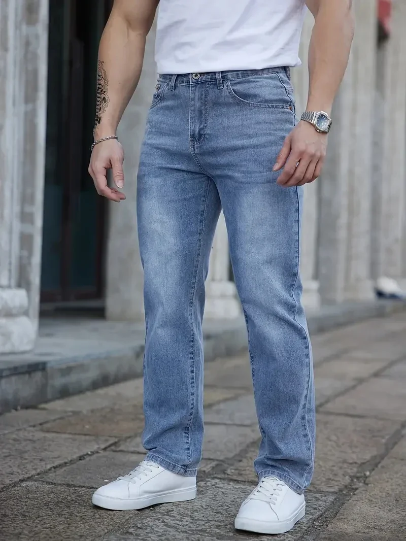 6 recensioni per Jeans larghi elasticizzati da uomo sottili estivi 2025 Pantaloni in denim dritti casual da lavoro con ricamo in vita elastica Stile classico maschile