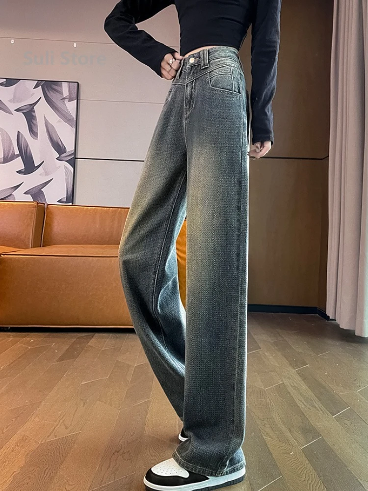 Jeans retrò a gamba larga da donna 2025 in pile ispessito a vita alta pantaloni dritti larghi e sottili con motivo a stella americana