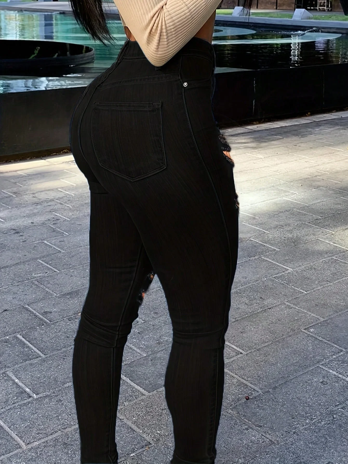 Jeans strappati neri slim fit da donna con tasche con cerniera e bottoni - Pantaloni in denim tinta unita alla moda casual 1Jeans strappati neri slim fit da donna con tasche con cerniera e bottoni – Pantaloni in denim tinta unita alla moda casual