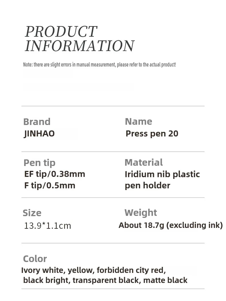 Agisci adesso!Lascia che questa penna stilografica a pulsante serie JINHAO 20, che unisce convenienza, leggerezza e comfort, ti accompagni nella scrittura in ogni momento meraviglioso!
