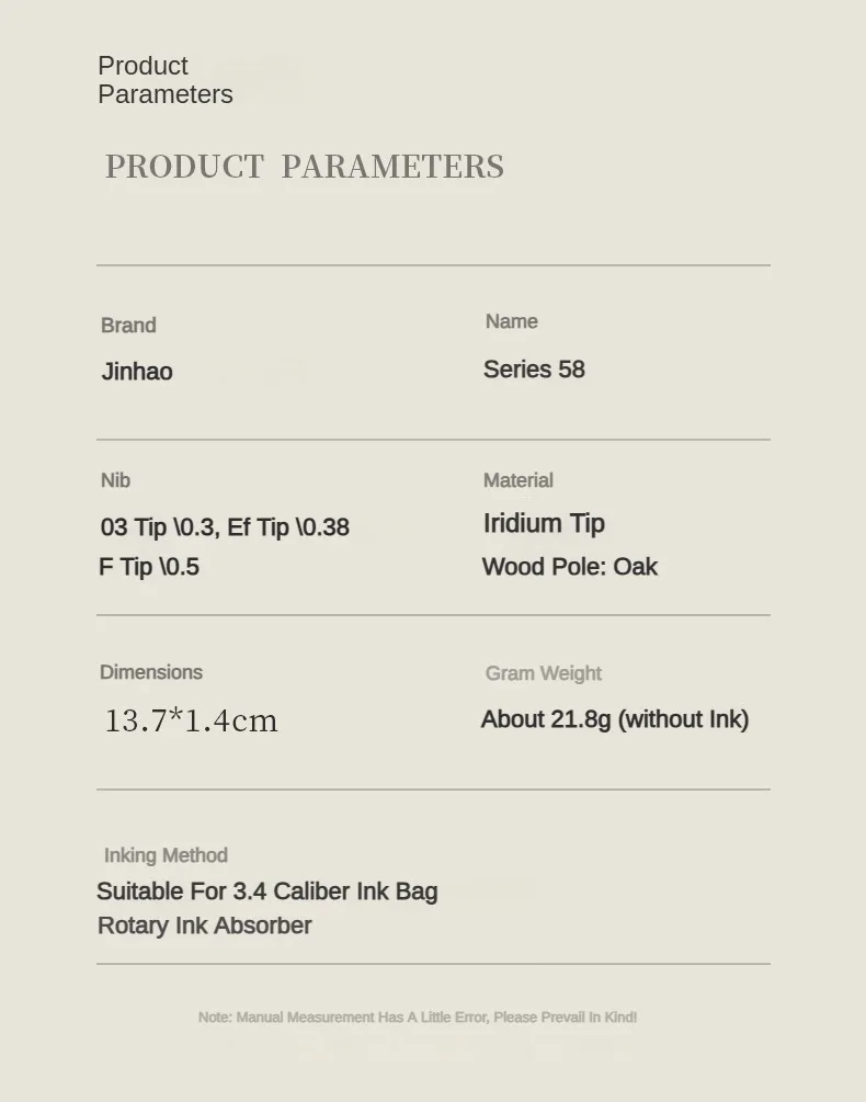 Scopri la bellezza della natura con l’ultima penna stilografica artistica in legno serie 58 di JINHAO.Realizzata in legno di rovere naturale di prima qualità, questa penna porta le meraviglie della natura a portata di mano, mostrando trame uniche che vanno dal giallo chiaro al marrone medio.Ogni penna è un’opera d’arte unica nel suo genere.