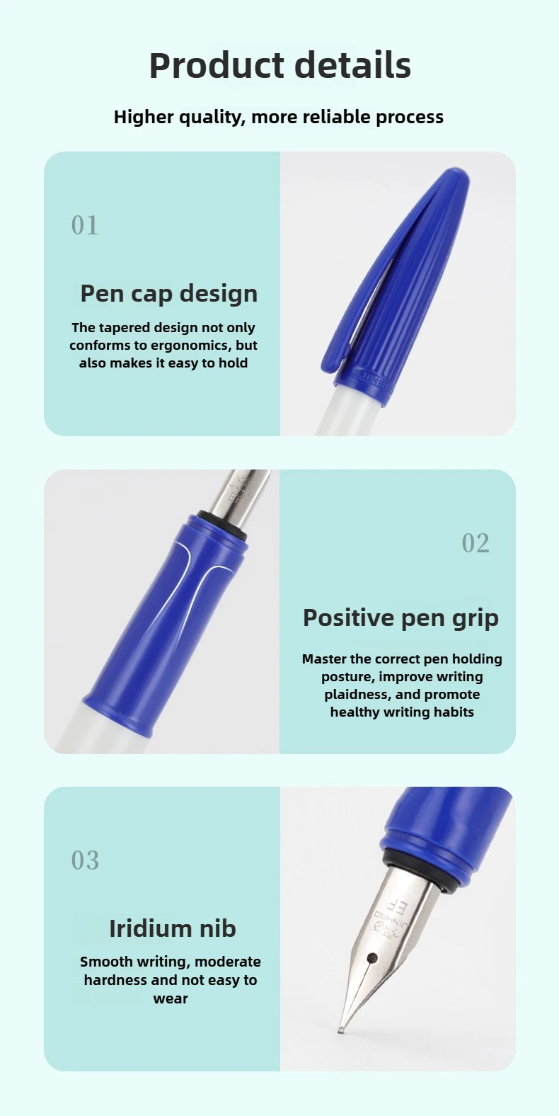Inoltre, utilizza un meccanismo di riempimento twist e cartucce d’inchiostro calibro 3,4 mm, rendendo il riempimento dell’inchiostro comodo e veloce, consentendoti di continuare a scrivere senza intoppi sempre e ovunque.Il design della presa corretta è conforme all’ergonomia, aiutandoti a padroneggiare la corretta postura di tenuta della penna, migliorando il comfort di scrittura e promuovendo abitudini di scrittura sane.