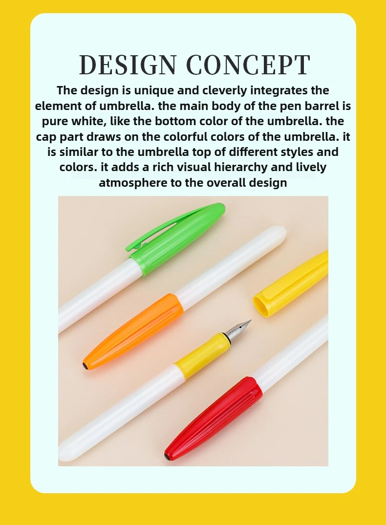 Questa penna stilografica vanta un aspetto eccezionale!Il corpo principale dell’asta della penna è bianco puro, come il colore di base della superficie di un ombrello, semplice ed elegante.La parte del cappuccio si assume ai colori vivaci degli ombrelli.Puoi scegliere tra sette colori vivaci: rosso, blu, giallo, verde, rosa, viola e arancione, per soddisfare le tue esigenze di abbinamento in diversi scenari.Che si tratti di lavoro d’ufficio aziendale o di scrittura quotidiana, può mostrare il tuo stile unico.