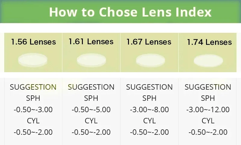 1 Se la somma dei tuoi numeri SPH e CYL è inferiore a 300 gradi, è generalmente raccomandato a scegliere le lenti con un’indice rifrattivo di 1,56.Di corso, lenti con un indice rifrattivo di 1.61/1.67 sono anche adatte, come sarà più sottile e più comodo da indossare.