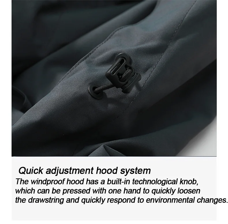 Il cappuccio antivento ha una manopola tecnologica integrata, che può essere pressata con una mano per allentare rapidamente il coulisse e rispondere rapidamente ai cambiamenti ambientali.