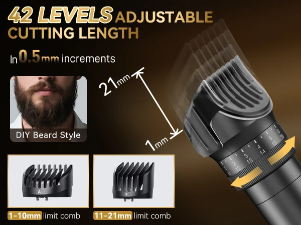2.Con 42 lunghezze di rifinitura regolabili, può essere utilizzata per tagli di capelli, rasatura e styling preciso, che ti consentono facilmente modellano la tua immagine.