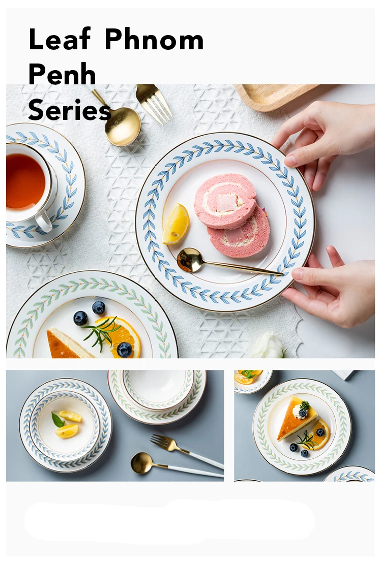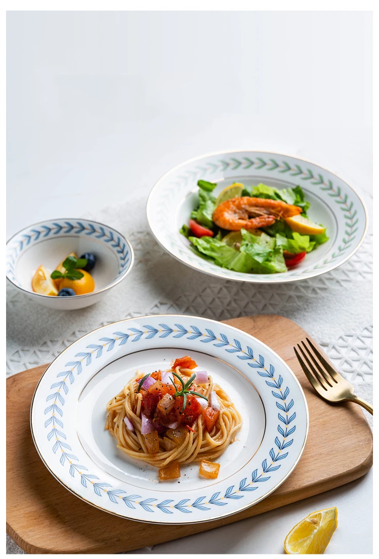 KINGLANG Nuovo piatto da pranzo in ceramica dorata con bordo a foglia Piatto da dessert per insalata di riso in porcellana all’ingrosso